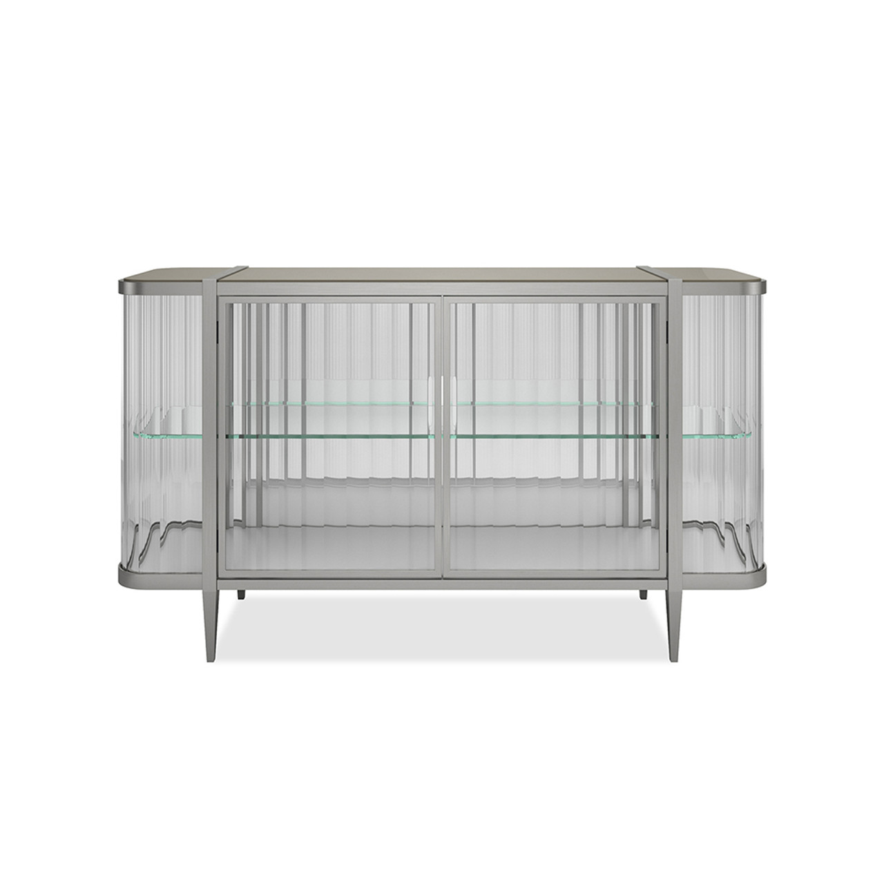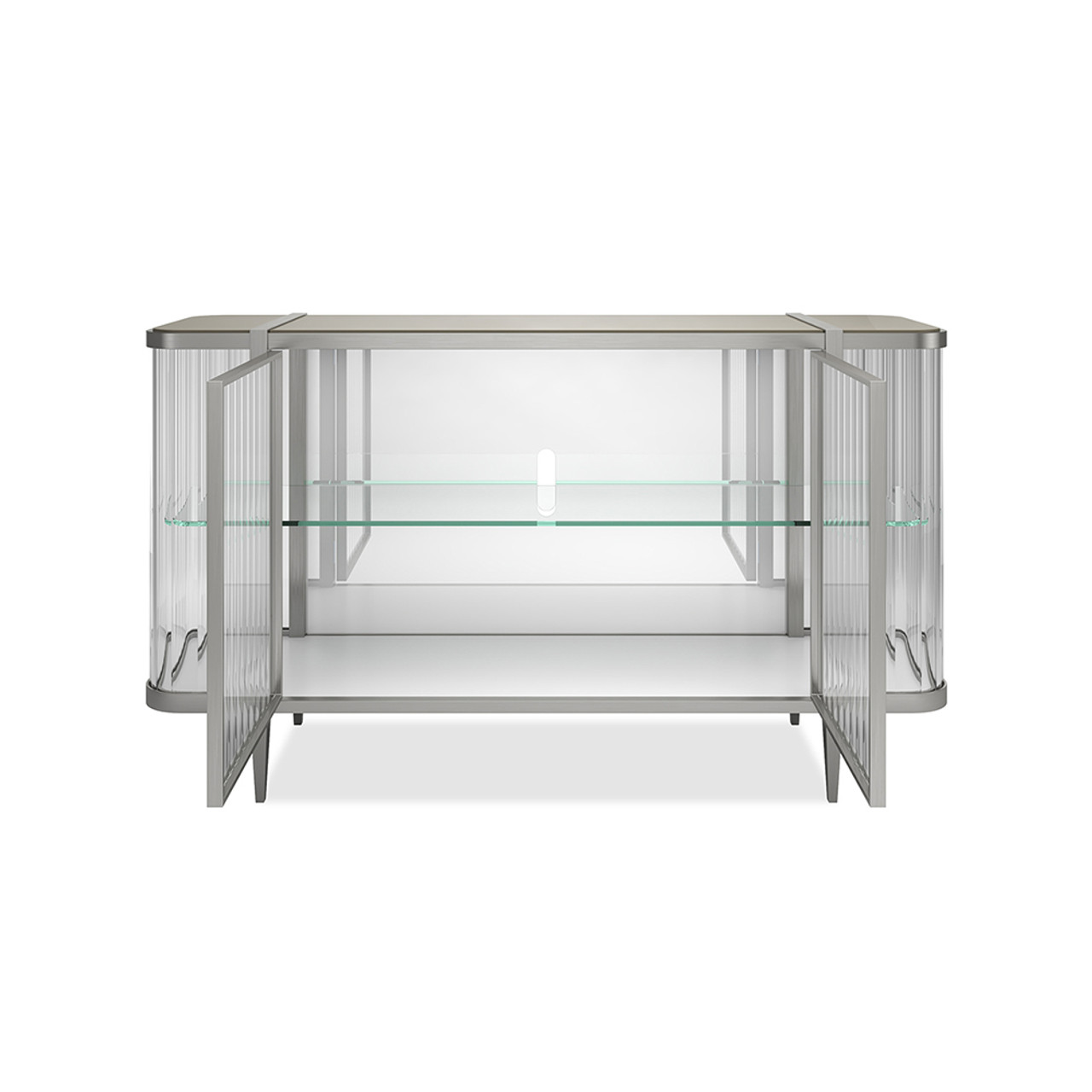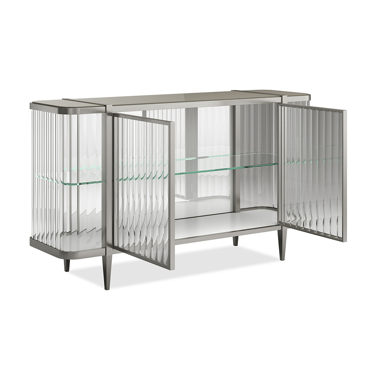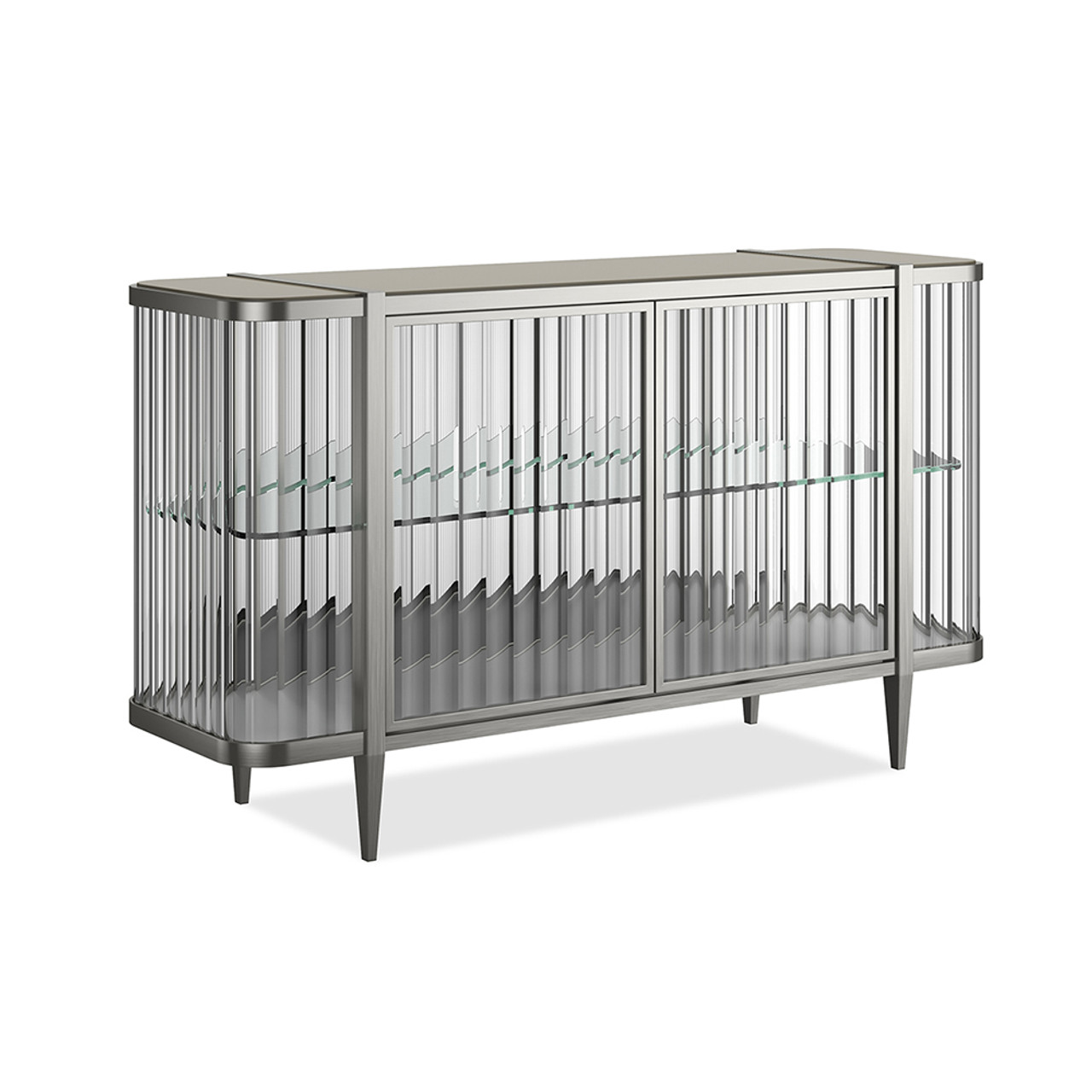 Финишная отделка Lightly Brushed Chrome подчеркивает плавные контуры и элегантность четырех конических ножек, придавая изделию эффект бриллианта в платиновой оправе. Этот буфет идеально впишется в современные интерьеры, добавляя им нотки утонченного блеска и функциональности.