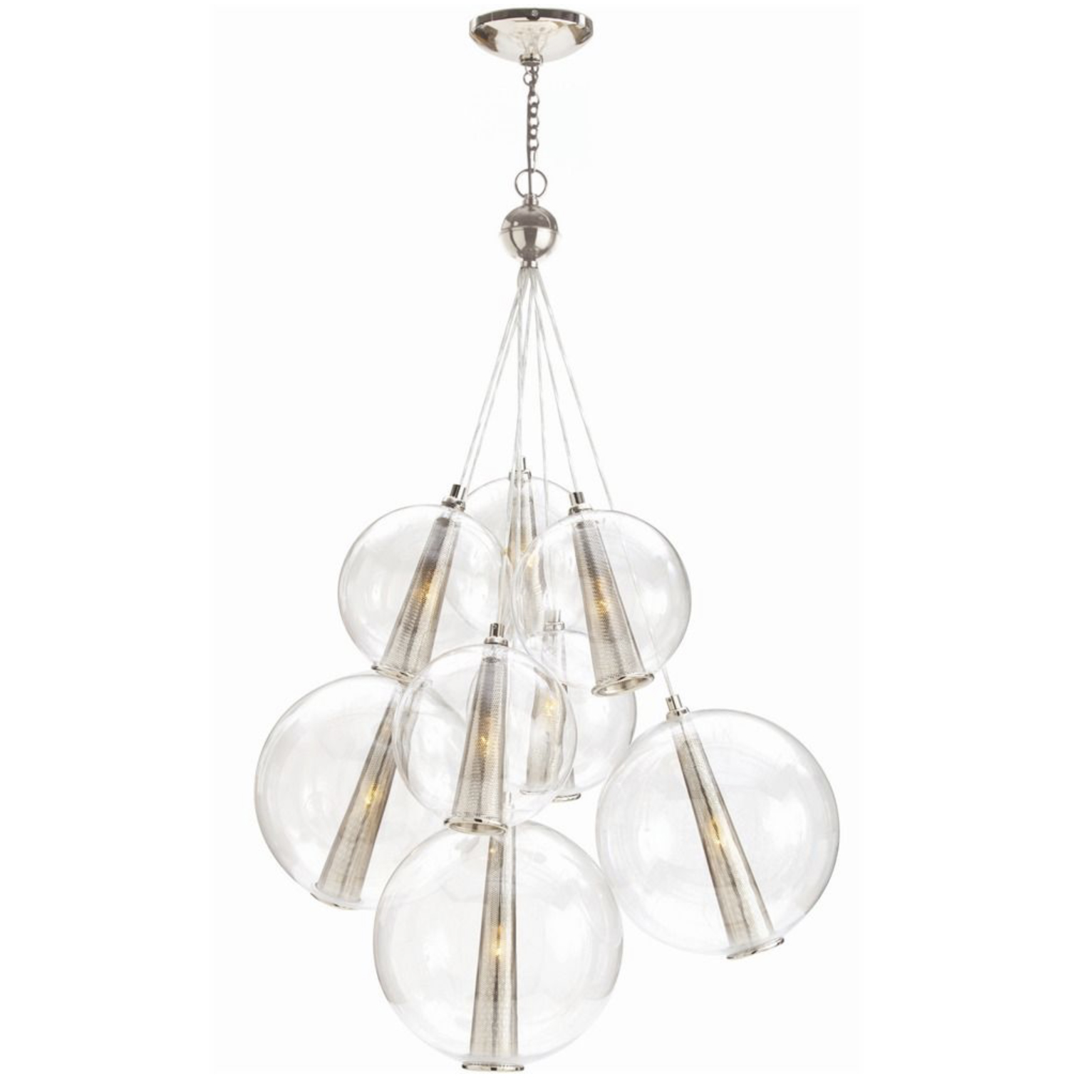 Люстра Caviar — выразительная световая композиция из прозрачных стеклянных сфер, словно парящих в пространстве.Металлические элементы в отделке полированного никеля подчёркивают хрустальную чистоту стекла и придают конструкции современный архитектурный акцент.Регулируемая высота (от 147 до 221 см) позволяет адаптировать люстру под высоту помещения — будь то столовая зона или центральная часть гостиной.