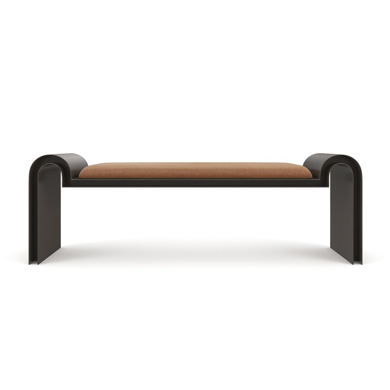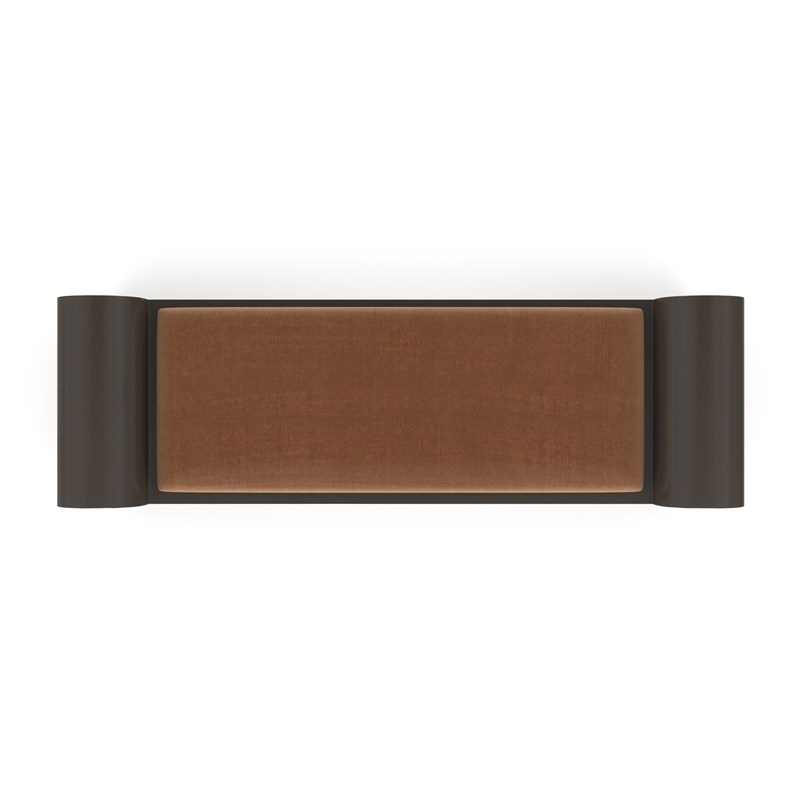 Если посмотреть на неё в профиль, становится заметно, что её основа состоит из двух массивных металлических листов в оттенке Brushed Deep Bronze, зеркально повторяющих форму друг друга — один из них проходит под другим, создавая динамичную архитектурную линию. Оба листа изящно согнуты по верхним краям сиденья, образуя мягкий изгиб в форме буквы U.