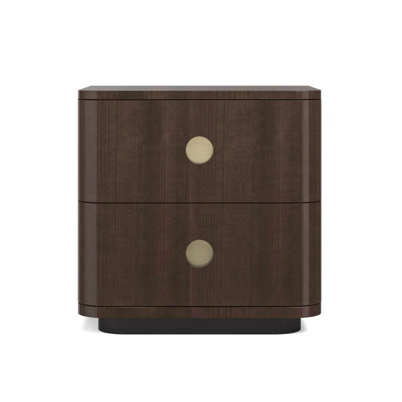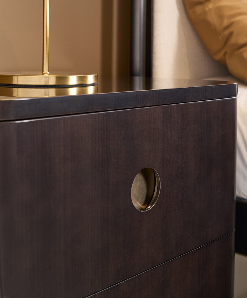Два выдвижных ящика с мягко закруглёнными передними кромками украшены встроенными декоративными элементами в виде иллюминаторов цвета золото шампанского, добавляя акцент благородного сияния. Ящики с системой плавного закрывания открывают доступ к вместительным внутренним отделениям, выполненным с отделкой UV Noir. Завершает образ утончённое основание в оттенке тёмного шоколада — финальный штрих, который делает Bachelor Small настоящим украшением интерьера.
