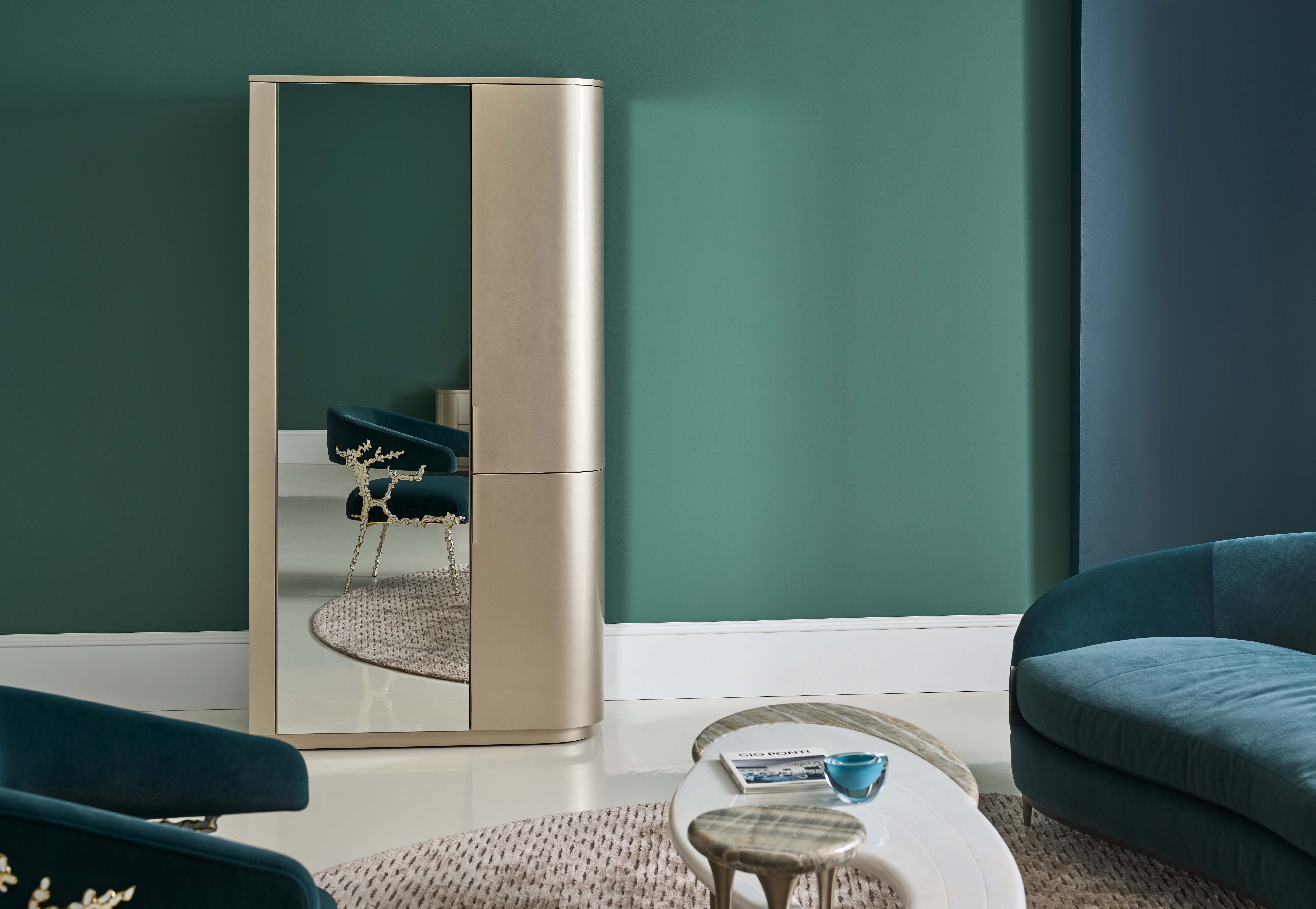 Большие панели из сочетания разных материалов и отделок создают утончённый эффект цветового блокирования. Корпус выполнен в изысканном деревянном исполнении с чёткими прямыми линиями, смягчёнными филёнчатыми краями. Внешняя отделка сияет благодаря лакированной поверхности Soft Silver Gloss в сочетании с кристально чистыми зеркалами, которые украшают фасад и боковые панели. Металлические ручки выполнены в утончённом оттенке Brushed Whisper of Gold, придавая финальный штрих образу.