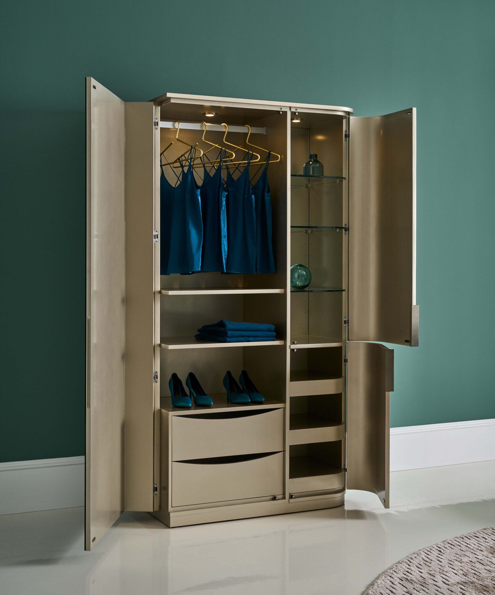 Слева шкаф оснащён съёмной штангой для одежды и четырьмя регулируемыми полками. Справа — два выдвижных ящика с мягкими направляющими. Верхняя правая часть впечатляет зеркальной задней панелью, тремя регулируемыми стеклянными полками и встроенным светильником с датчиком движения. В нижней части — три выдвижных лотка для хранения мелочей. Внутренняя отделка выполнена в нежном серебристом оттенке Soft Silver Paint Gloss, а утончённый цоколь подчёркнут элегантным цветом Whisper of Gold.