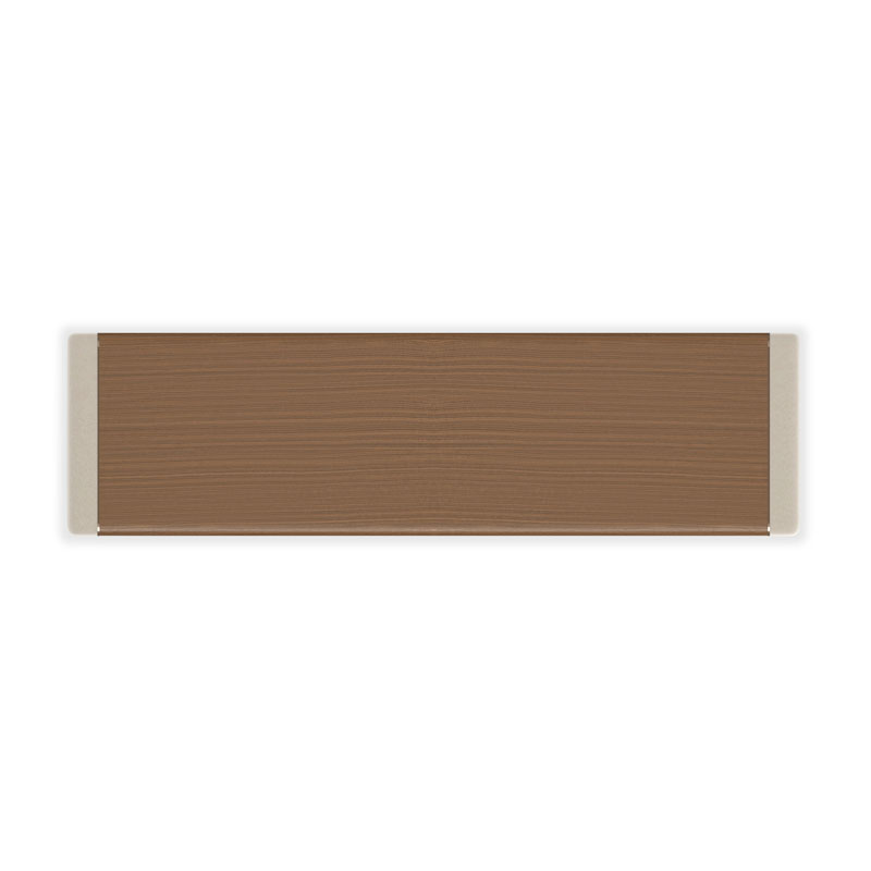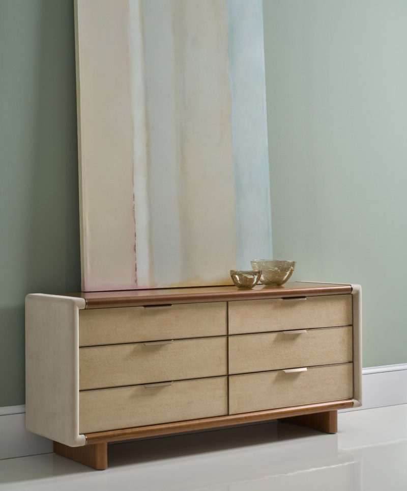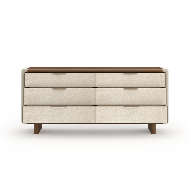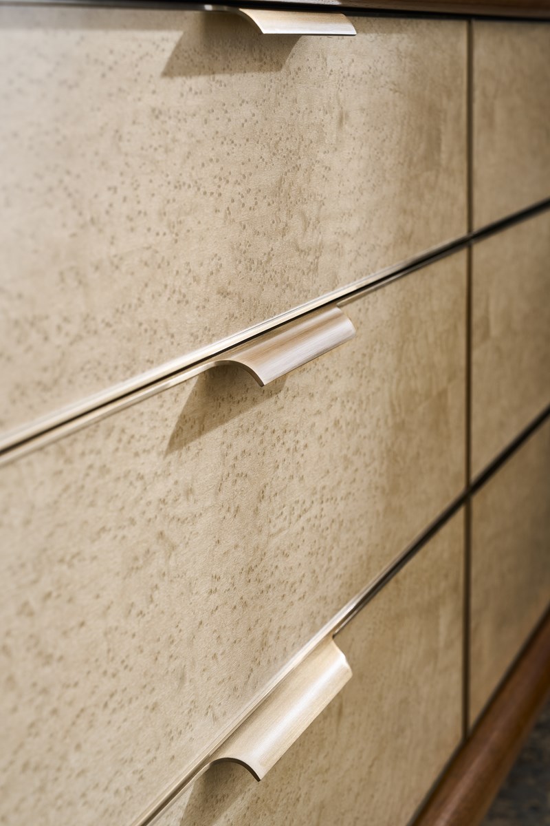 Фасады шести вместительных выдвижных ящиков украшены миниатюрными вставками из клена Birdseye со светло-дымчатой отделкой, а торцы отделаны микрозамшей цвета камня. В текстуру ореха тонко вкраплены бусины из металла цвета Brushed Gold, подчёркивая утончённость изделия. Внутренние поверхности ящиков отделаны УФ-лентой, а эффектные изогнутые ручки из того же металла элегантно опоясывают фасады, создавая целостный и изысканный образ.