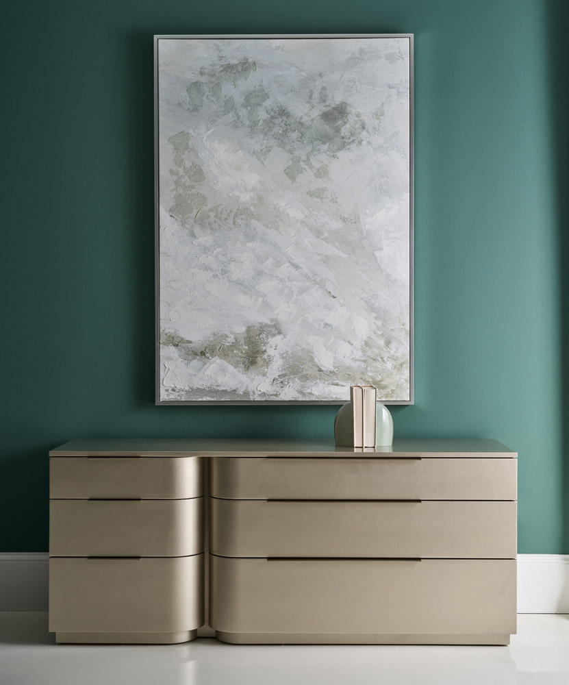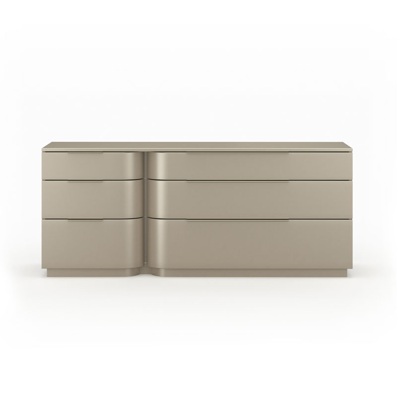 Комод Oblique впечатляет динамичным дизайном: глубоко наклонённые филёнчатые ящики сходятся в эффектном смещённом центральном разрезе. Весь корпус покрыт сияющим лаком Soft Silver Gloss, а акцентный разрез подчеркнут матовой отделкой Whisper of Gold.