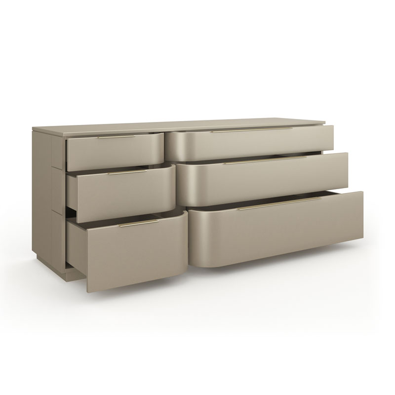 Тонкие металлические ручки в оттенке Brushed Whisper of Gold, украшенные логотипом Caracole, добавляют утончённости. Шесть выдвижных ящиков разной глубины оснащены направляющими с плавным закрыванием, обеспечивая продуманное и вместительное хранение. В верхнем левом ящике предусмотрен специальный выдвижной лоток для украшений, отделанный кремовым бархатом — функциональное решение с элегантным акцентом.