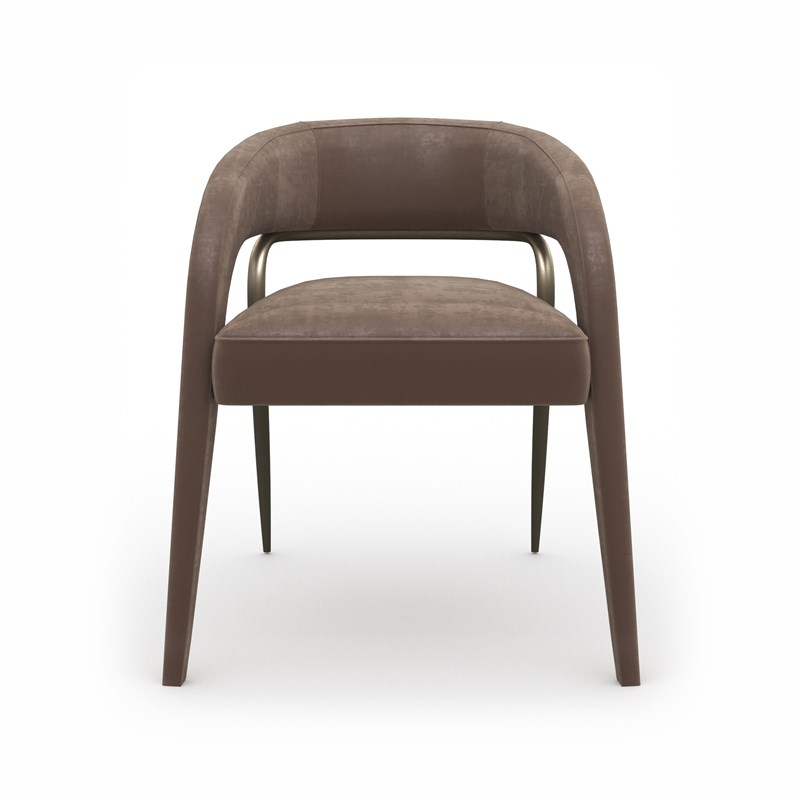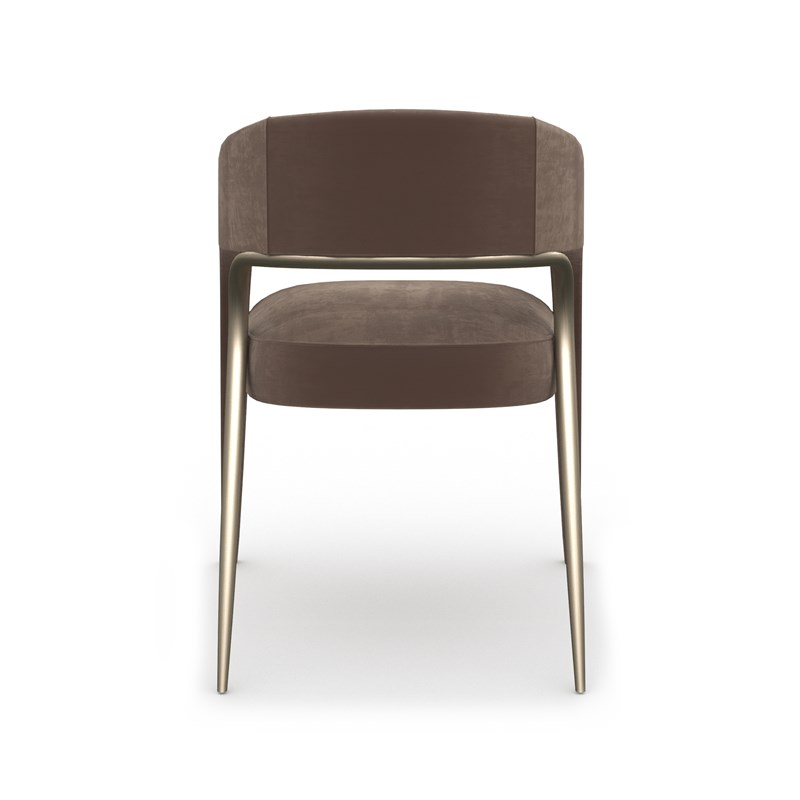 Уникальная спинка плавно изгибается над подлокотниками и спускается по передним ножкам, которые эффектно выдвинуты вперёд. Контрастом к мягкой обивке выступают изогнутые задние металлические ножки цвета Brushed Gold, устремлённые назад и напоминающие лёгкий силуэт стремительной газели. Такой стул идеально дополнит интерьер, где ценят изысканные линии и утончённые детали.
