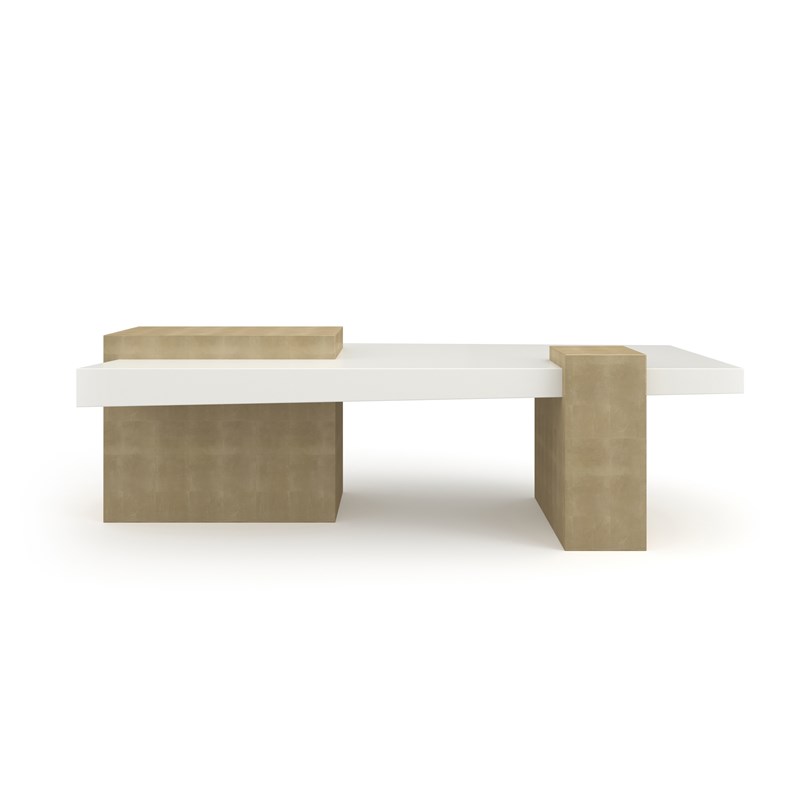Визуальный эффект «парения» достигается за счёт двух массивных прямоугольных оснований, смещённых на одном конце и расположенных напротив друг друга. Их поверхность украшена ручной аппликацией из листьев оракала, которые создают яркий контраст с лаконичной столешницей.