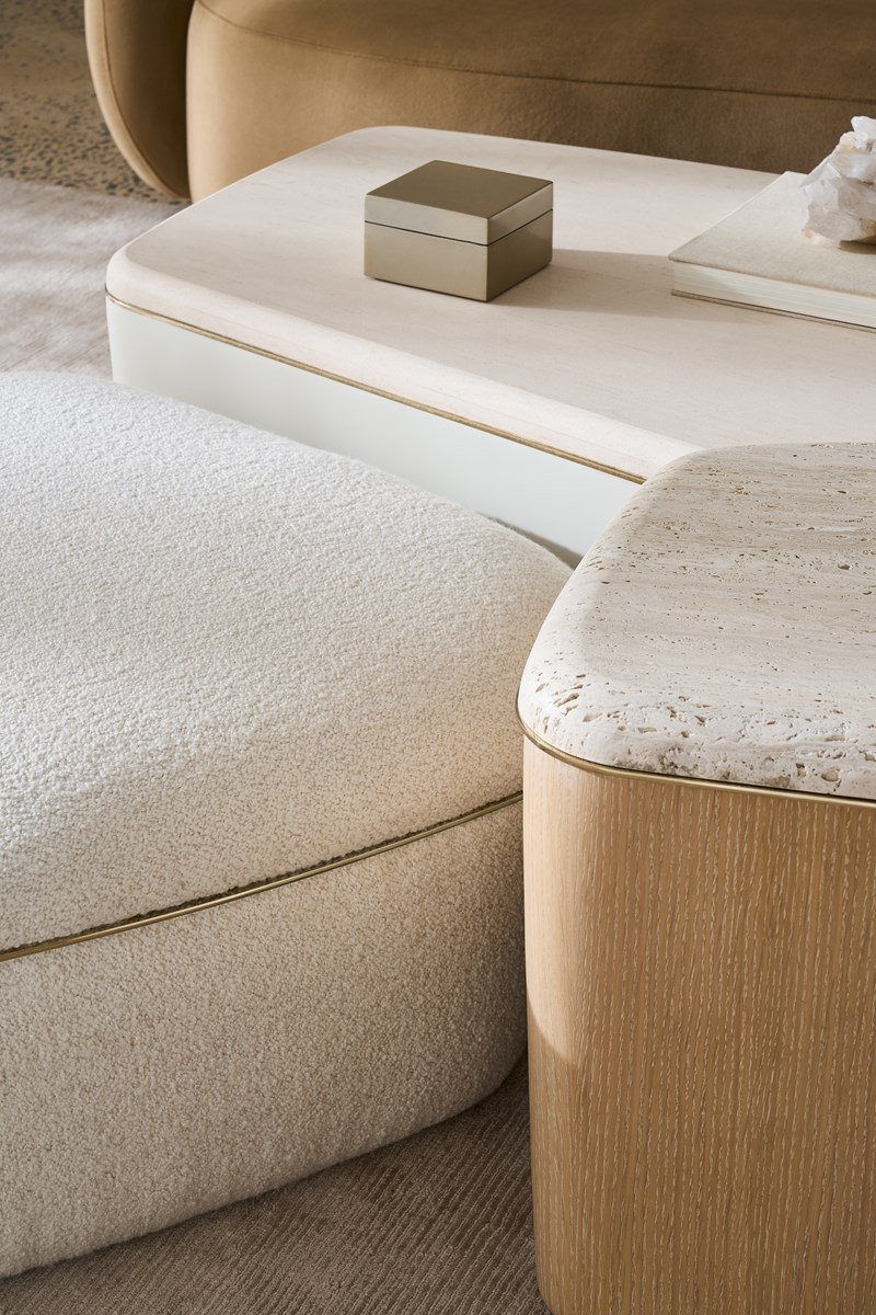 Названный в честь знаменитой галечной пустыни Африки, журнальный столик Medium Serir отличается органичной пятигранной формой с мягко округлёнными сторонами. У него нет одинаковых граней — как у природного камня, отполированного временем. Столешница выполнена из гладкого травертина Crème Travertine и украшена тонкой металлической полосой цвета Whisper of Gold. Боковины обиты фактурным букле Ivory Mélange Performance, основание окрашено в почти белый оттенок. Съёмная столешница открывает дополнительное место для хранения, а внутренняя часть отделана в том же светлом тоне.