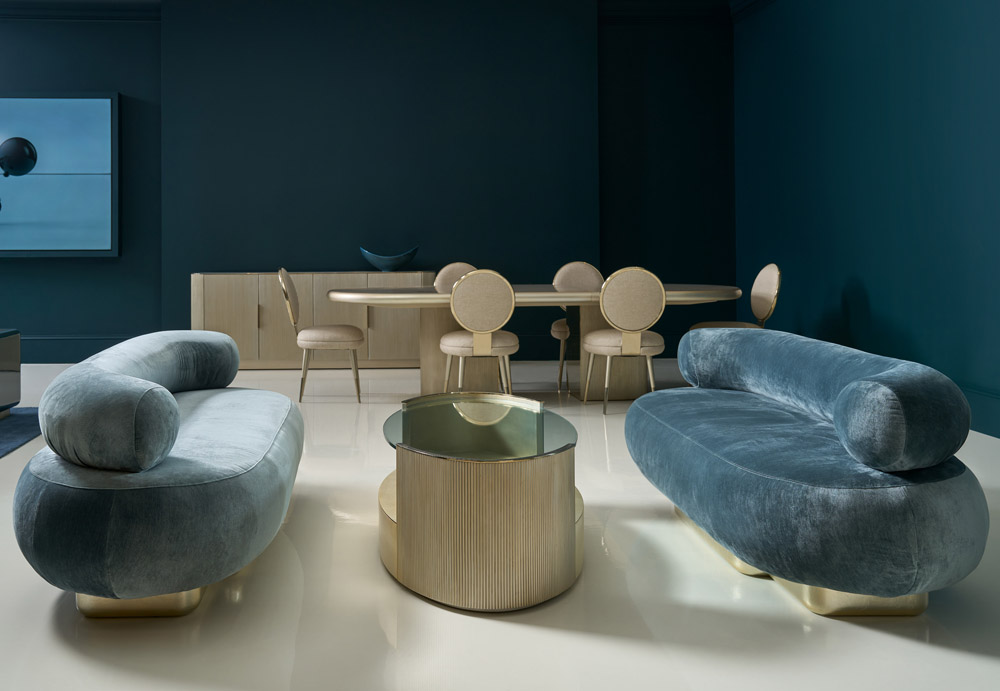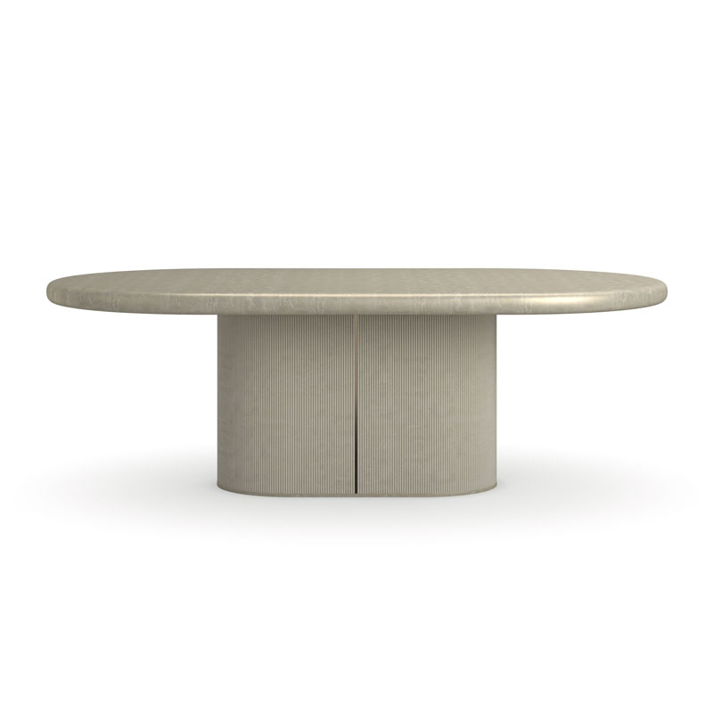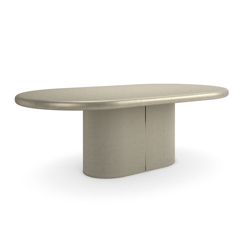 Элегантный овальный стол Love притягивает взгляд утончёнными деталями. Основание-бочонок из двух частей оформлено вертикальными тростниками, изысканный акцент, добавляющий глубину. При раскрытии открываются боковые панели с зеркальными вставками цвета Whisper of Gold, создающими мягкое свечение. Столешница в оттенке Oracle обрамлена тонкой металлической лентой в том же тоне. В разложенном виде за столом свободно собирается до 12 гостей — просторно, красиво, достойно настоящих встреч.