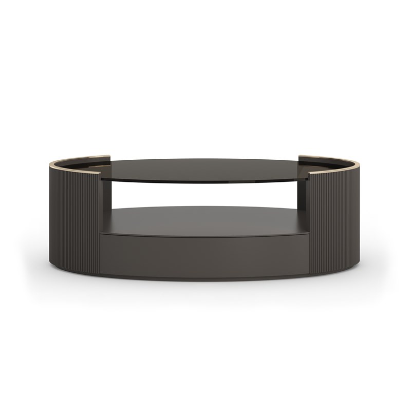 Соберитесь за овальным журнальным столом LOVE. Прозрачная стеклянная столешница придаёт лёгкость, а полукруглые корпуса по краям украшены рифлёными вставками с ручной аппликацией Dark Chocolate. В конструкции предусмотрена открытая зона хранения и один выдвижной ящик с рифлёной передней панелью, удобным нижним захватом и фурнитурой с плавным закрыванием. Внутренняя отделка выполнена в тон остальным элементам.