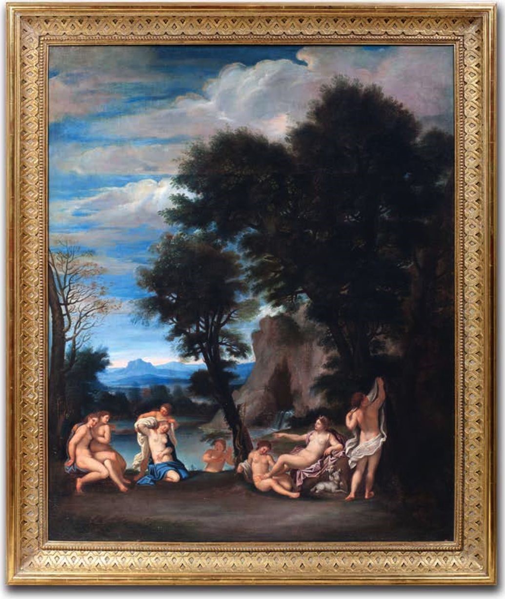 «Купание богини Дианы» - античная мифология, повествующая о прекрасной богине охоты Диане, которая отождествлялась еще и с богиней луны Селеной. Вечно юная, прекрасная, как ясный день, Диана изображалась всегда с колчаном, луком и стрелами. Она проводила время в тенистых лесах и горах, охотясь в окружении нимф и сопровождении своры собак. Веселый смех, крики, лай далеко разносились в горах, вызывая громкий отклик горного эха. Уставшая богиня любила отдыхать в дышащих прохладой, увитых зеленью гротах, или лесных озерах, вдали от взоров смертных. Неизвестный художник обратился к историческому жанру и использовал методы стиля классицизм. В композиции картины «Купание богини Дианы» большую роль играет пейзаж - совершенный и гармоничный. Трактованный героически, с деревьями, скальными гротами и озером, горными вершинами, бело розовыми облаками, пейзаж воспринимается величественным. Обращение к «высокому» жанру обеспечил художнику выбор персонажей - богинь и нимф - высших духовных созданий. Тщательно продуманное и выверенное соотношение групп и связь между фигурами способствует восприятию их непринужденными и свободными. Элементом моделировки формы стали линия и светотень. Локальные цвета четко выявляют пластику фигур и раскрывают перспективную глубину.