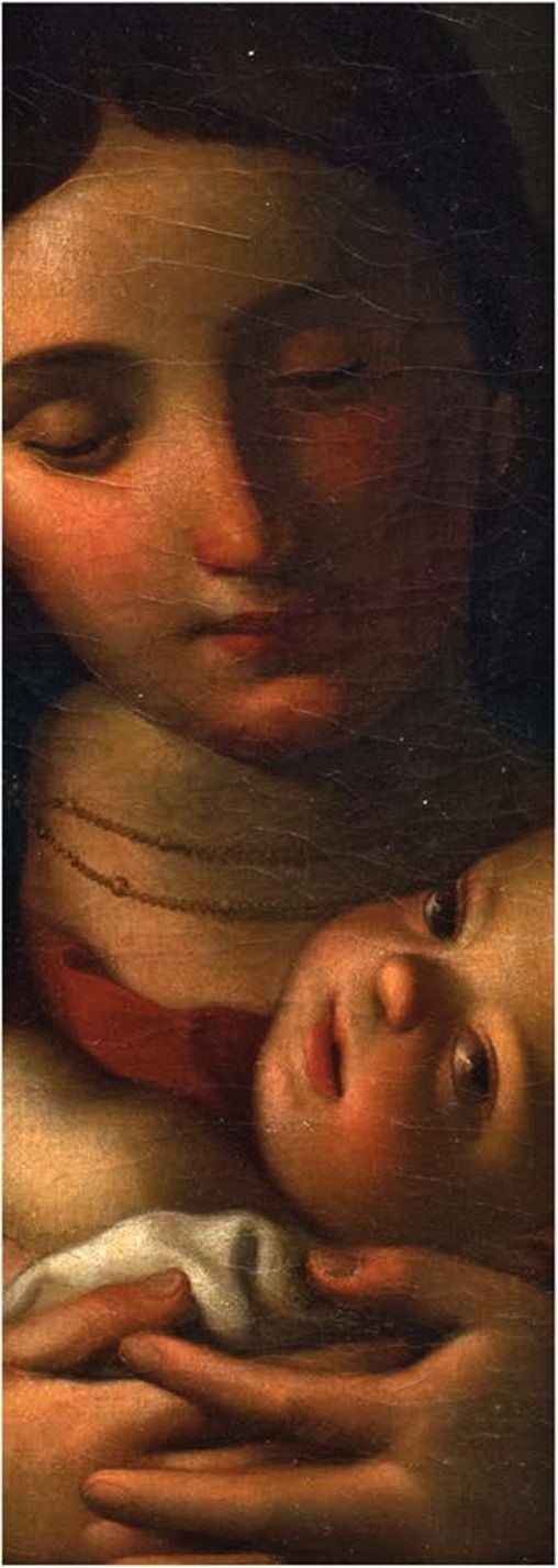 Мадонна - чаще всего изображается юной, прелестной, с мягким лицом, нежными губами, задумчиво полуприкрытыми глазами. Образ повторяется, варьируется, изменяется, идеализируется, Мария выглядит то моложе, то старше, но во всех работах - это женщина выражает одну идею - воплощение Материнства. Она волнует нас живой прелестью и какой-то тайной, связанной с ее жизнью, которую сложно постичь. Мария в произведениях художников очень часто выражает состояние счастья и покоя. Играет ли она со своим сыном, держит ли его на коленях, как на данной работе, забавляет ли его грушей - она прекрасна. А ребенок - настоящий малыш с большой круглой головкой, с пухлыми ручками и ножками. Чтобы создать такой образ младенца, нужно много наблюдать детей и бесконечно рисовать их, а главное - любить. Художник, вероятнее всего, человек верующий, он обожествляет Материнство - великий залог бессмертия рода человеческого. Картина является типичным и превосходным по качеству исполнения образцом обращения к теме материнства. Здесь использован принцип построения композиции расположенной на первом плане фигурной группы, благодаря чему движение развивается из глубины к зрителю. В работе возникает сложный мотив инсайта и обращения Божественного младенца прямо к зрителю.