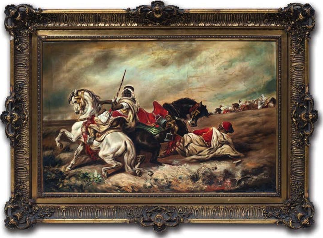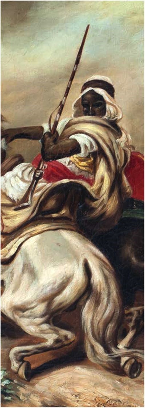 Берберы - это совокупность многих племен, населяющих Северную Африку, от Египта на востоке до Атлантического океана на западе, от Судана на юге до Средиземного моря на севере. Больше всего берберов проживает в странах Магриба, что переводится с арабского - «там, где закат»: Марокко, Алжир, Тунис, Ливия. Существует версия, что название Бербер произошло от латинского barbarus - «варвар». Так римляне называли все народы, культуру и язык которых не понимали. К сожалению, берберских источников об их собственной истории и культуре не сохранилось, что, в общем-то и неудивительно, учитывая количество завоевателей, которые волнами накатывали на этот древний народ. В 7-8 веках вся Северная Африка была завоевана арабами и вошла в состав Арабского халифата. Берберы не раз поднимали восстание против завоевателей и исламизации. Но уже в 8 веке берберские племенные ополчения вместе с арабами участвовали в завоевании Испании. Вероятнее всего неизвестный художник обратился к этой теме из-за ее популярности в Европе с конца 18 века. Ориентализм пронизывает все творчество Жана Энгра, Эжена Делакруа и многих других художников. Эта тенденция опиралась на ряд экзотических признаков, свойственных восточному мировоззрению. К ориентализму историки искусств также относят обращение живописцев к североафриканским образцам, благодаря использованию этнографических реалий Магриба, как в данном случае. Динамичная, экспрессивная композиция картины «Сражение берберов», пронизанная движением, яркая, декоративная красочная палитра говорят об увлечении художником темой, взятой из жизни загадочного народа берберов, чья история и сегодня полна тайн.