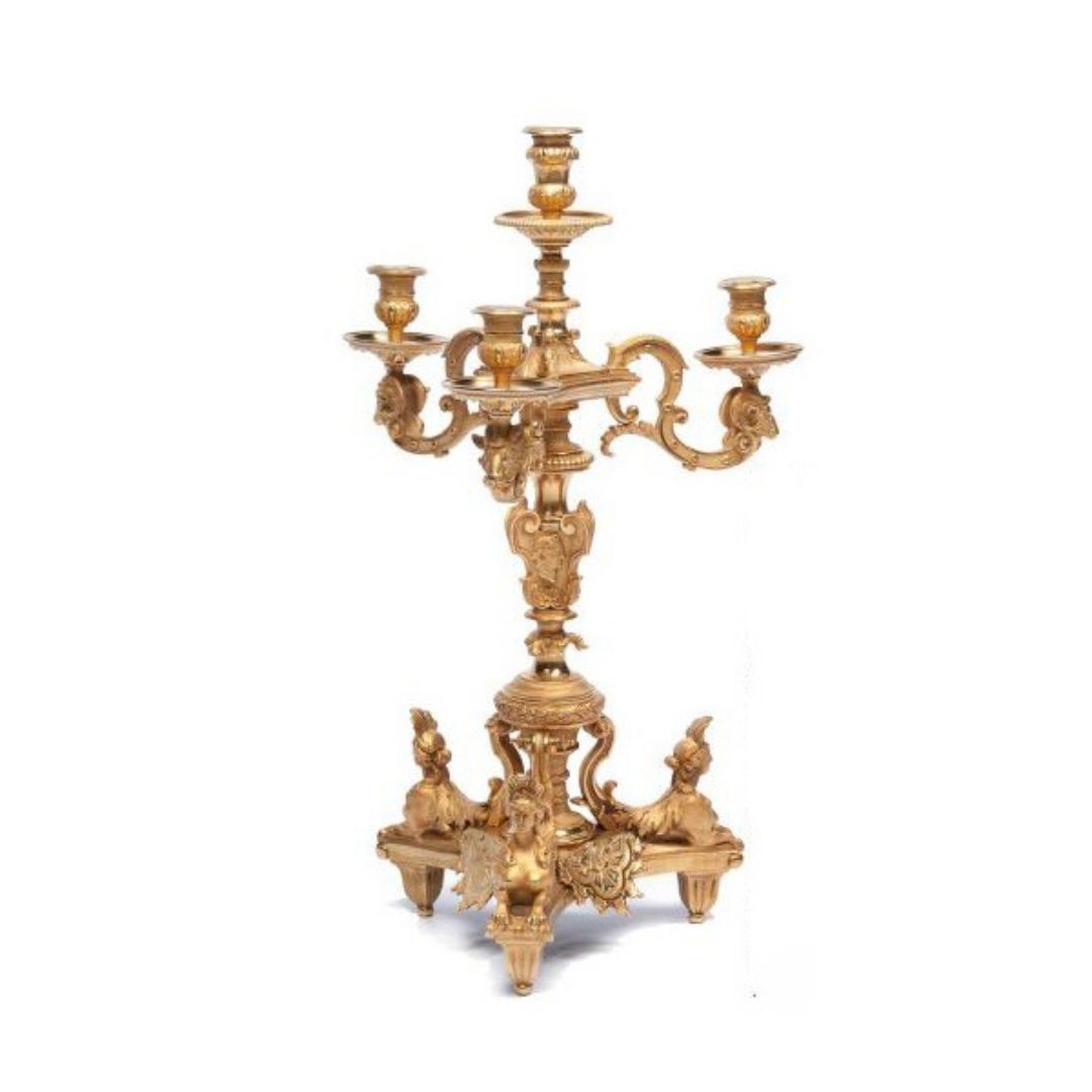 Четырехрожковые парные канделябры, их остов выполнен из бронзы в технике литья. Изделия декорированы стилизованными изображениями головы архара, сфинксами в образе льва-женщины. Исходя из анализа стилистики пары каминных осветительных приборов, можно сказать, что они созданы в стиле модерн, который господствовал на рубеже 19-20 веков. Модерн выработал собственные приемы, основанные на принципах орнаментальности, декоративности и асимметрии. Объектами стилизации становятся природные формы, что объясняет интерес к криволинейным силуэтам и волнистым контурам. Наиболее заметной особенностью модерна стал отказ от прямых углов и линий в пользу плавных, изогнутых линий. Модерн стремился стать синтетическим стилем, в котором все элементы из окружения человека были выполнены в одном ключе. Вот почему в этот период возрастает интерес к прикладным искусствам. Представленные канделябры «сотканы» из плавных форм и линий: изображения сфинксов «вытекая» из растительного орнамента органично сливаются с пологими объемными формами нижнего основания. Неровность силуэтов и контуров, обращение к образам фантазийных животных - суть стиля модерн.