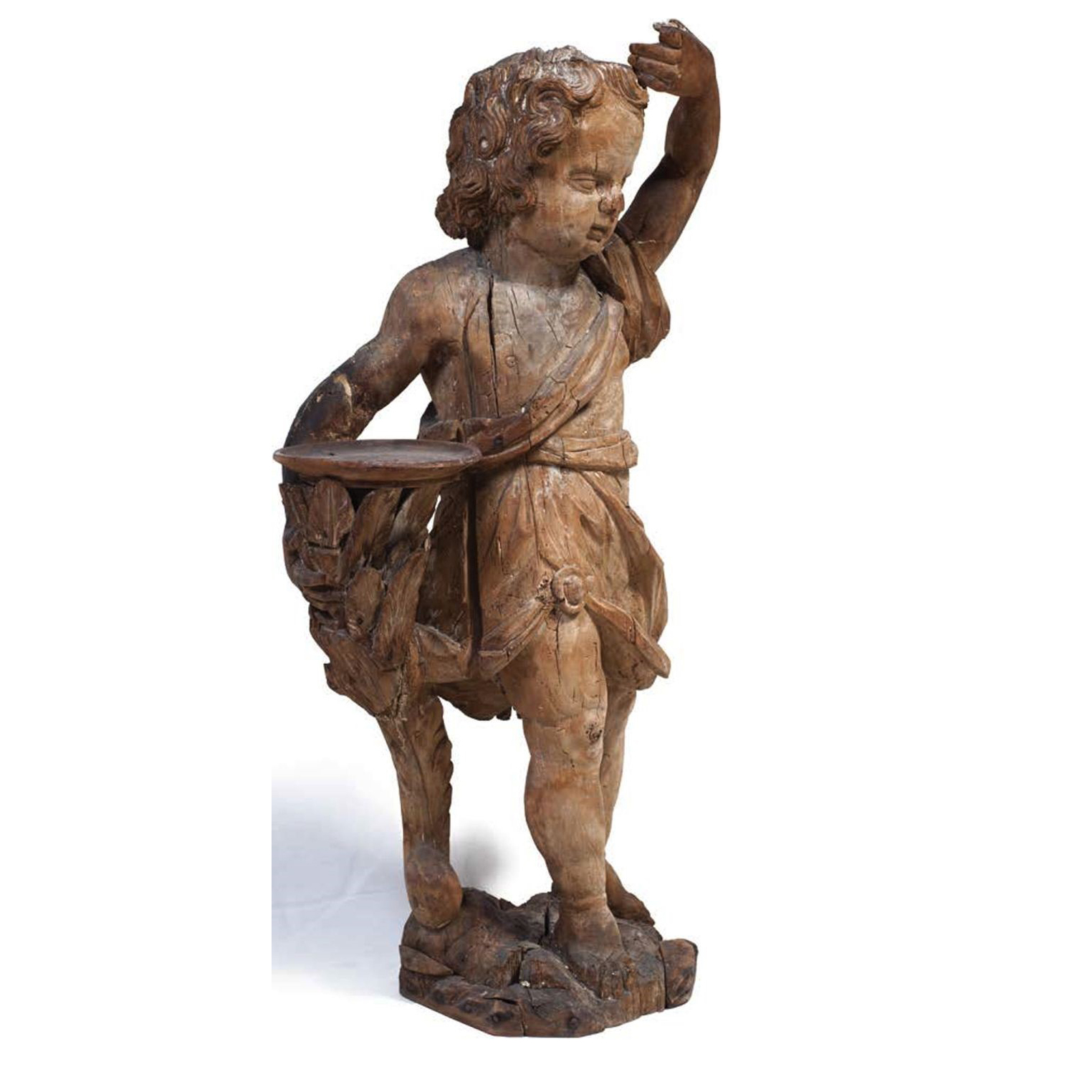 Скульптор изображает мальчика, одетого в легкую тунику, в левой руке держащего рог изобилия. А правая поднята вверх, для защиты от солнца и, чтобы рассмотреть предмет, находящийся вдали. Возможно, мастер создал изображение Бога богатства Плутоса из греческой мифологии. Плутос был сыном Деметры и Иасиона, родился на острове Крит. Он часто изображался в образе мальчика с рогом изобилия - символом плодородия и богатства. Мастер сумел передать в скульптуре ощущение движения, благодаря использованию контрапостной композиции, выстроенной на пересекающихся диагоналях, облегающей тело мальчика, в передаче складок ткани, замечательной, тонко проработанной резьбе. Скульптуру «Мальчик с рогом изобилия» можно отнести к малой пластике, тяготеющей к декоративности и носящей прикладной характер. Сегодня этот вид искусства востребован, к нему наблюдается большой интерес. Скульптуре требуется реставрация.