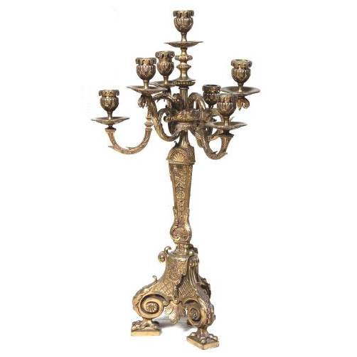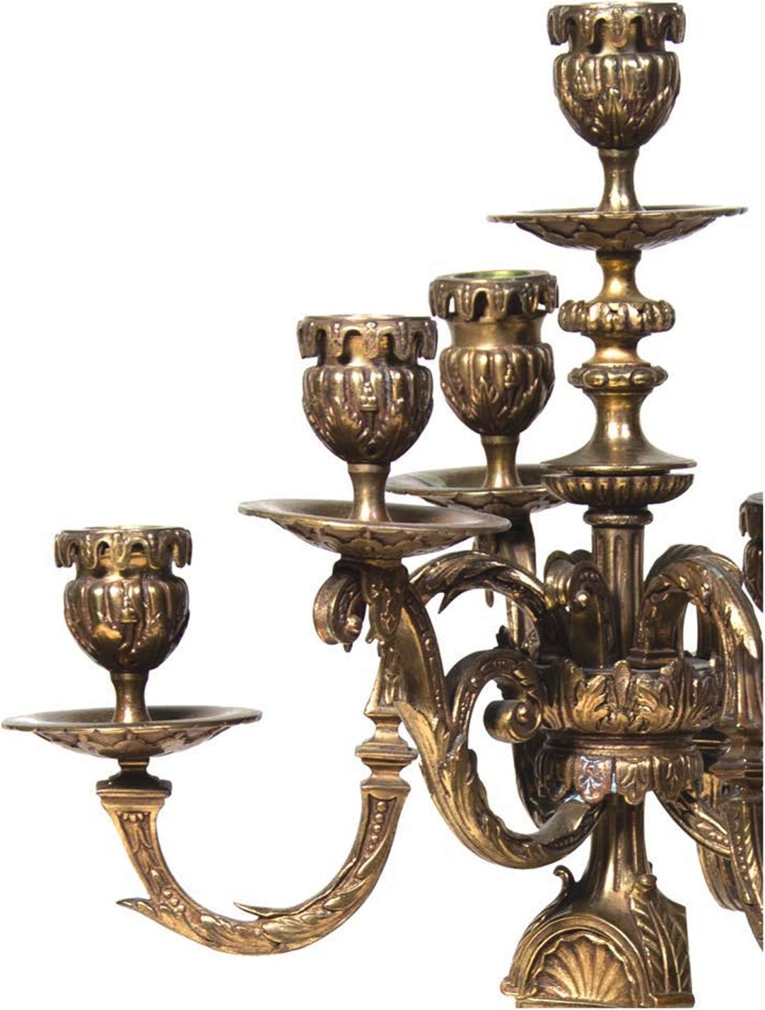 Канделябр - это сочетание красоты и функциональности, в нем присутствует дух старины и изысканности. Предмет декора, может удачно вписаться в абсолютно любой интерьер, он отлично смотрится в классической обстановке, создавая особенный традиционный уют. Семирожковые канделябры выполнены в стиле модерн, где господствует причудливая, гибкая линия, ассоциирующаяся с фантастическими растениями, а их цветочные соцветия трансформируются в чаши для свечей. В декоративном оформлении трехчастной ножки присутствуют листья аканта, геральдические мотивы, трилистники. Три фрагмента основы опираются на изображения птичьих лап, что было несомненным атрибутом стиля модерн, который процветал на рубеже 19-20 веков. Изделие изготовлено из бронзы в технике литья, ковки и штамповки. Оно покрыто патиной, что подчеркивает богатство и значимость интерьерного аксессуара.