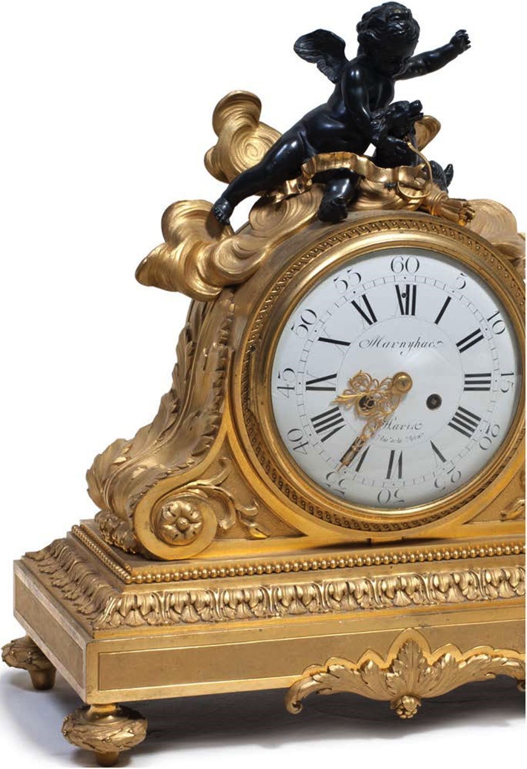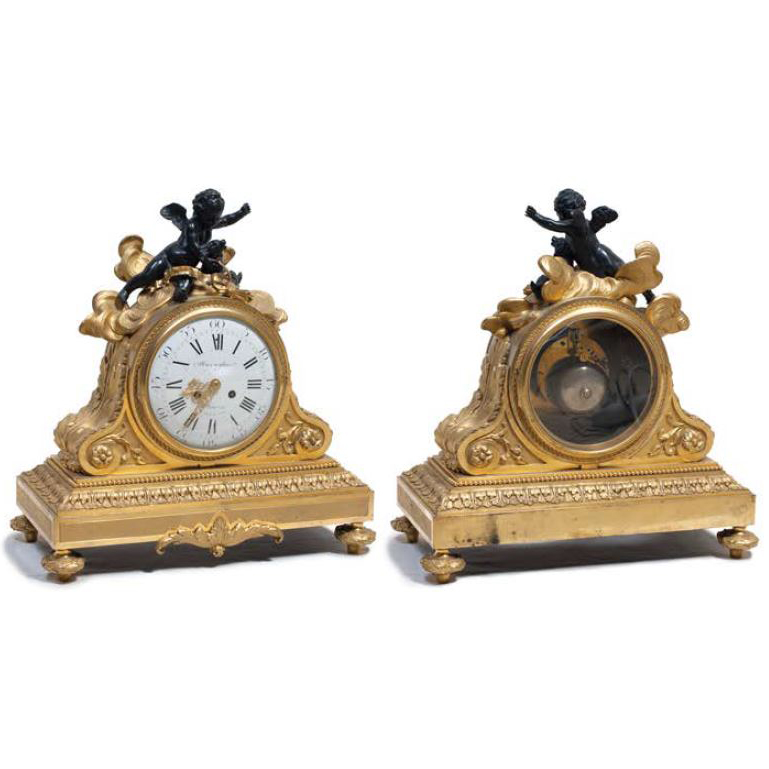 Кабинетные часы, опирающиеся на постамент прямоугольной формы и четыре ножки-шарики. Постамент сложного профиля, декорирован растительным и геометрическим орнаментом, который соединен своеобразными волютами с часовым механизмом. Часовой механизм встроен в круг, венчается скульптурным изображением ангела с собакой. Фигурки патинированы черным цветом. Декоративные элементы часов выполнены из бронзы. Каждый сантиметр внешней поверхности часов оформлен элементами стиля рококо. На часовом механизме имеется надпись: «Marnyhac». Часы в рабочем состоянии. Содержательные и формальные признаки часов позволили предположить, что они созданы в стиле историзм. Он основан на смешении элементов ранее доминировавших в искусстве стилей. Был наиболее распространён с 1830-ых годов. Историзм допускал обращение не только к классике. Любой исторический период или стиль могли стать прообразом для будущего произведения. Часы «Ангел с собакой» изготовлены на предприятии Мезон Марниак, о чем свидетельствует надпись на циферблате и стилистика изделия. Компания специализировалась на создании элитных, роскошных предметов и аксессуаров дизайна интерьеров. Она принимала участие во Всемирной выставке 1878 года, где была отмечена медалью. Обозреватели этой выставки говорили, что: «в Париже есть два Барбедьена, два художественных промышленника столь высокого уровня, что во всей Европе нет им конкурентов».