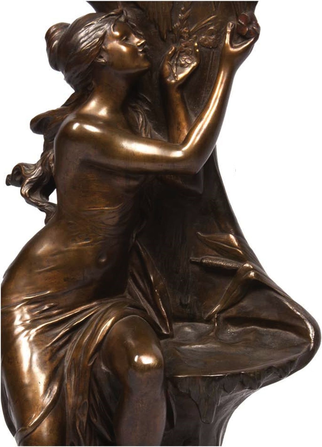 Скульптура малых форм «Эльфийка, любующаяся цветами» изображает юную девушку в облегающей одежде. В правой руке она держит полевые цветы с колосьями пшеницы, а другой придерживает цветы вьюнка, спускающиеся с каменного выступа, на который она присела на мгновение. С расщелины бежит небольшой струйкой вода, а внизу растет камыш с округлой головкой соцветия. Скульптор умело передает состояние эльфийки, ее лицо выражает восхищение совершенством форм вьюнка. В последние годы многие европейские аукционные дома (Сотбис, Кристис, Друо) проявляют повышенный интерес к произведениям этого замечательного французского скульптора. Эдуард Друо родился во Франции в Сомвауре в 1859 году, учился у известных скульпторов Тома Эмиля и Матурена Моро. Моро был приверженцем академического направления, создавал активизированные фигурные композиции, обращался к стилю историзм. Друо неоднократно принимал участие в парижских Салонах, получал награды, работал преимущественно в жанровой скульптуре. Подписывал свои работы двумя подписями: «Drouot» и «Е. Drouot». Скульптура малых форм «Эльфийка, любующаяся цветами» подписана «Drouot», выполнена в стиле историзм, с использованием элементов модерна, академизма и символизма.