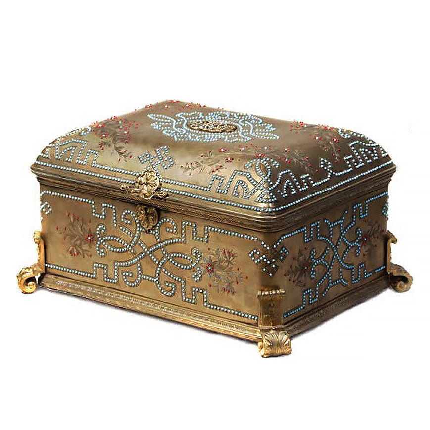 Шкатулка декорированная рельефным орнаментом из металла и бирюзы.