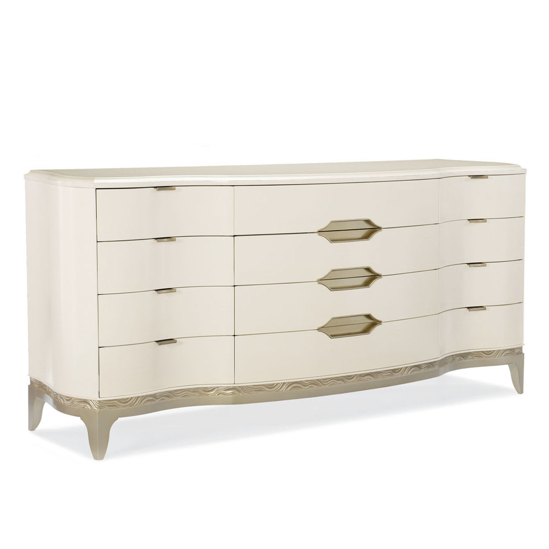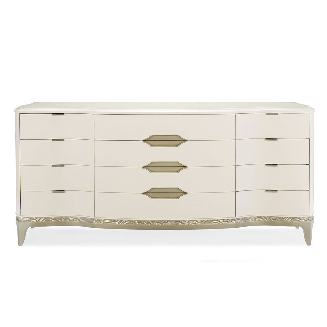 Комод Adela — это универсальное сочетание благородства и актуальных трендов в дизайне. Несмотря на внушительный размер, изделие выглядит вполне изящно: таковым его делают плавные изгибы, резные трапециевидные ножки и удлиненные утопленные ручки на центральных фасадах. Основание корпуса модели из древесины клена с кремовой отделкой украшает узор, напоминающий тонкую серебристую нейлоновую ленту. Предмет оснащен двенадцатью ящиками с доводчиками. Внутреннюю поверхность верхних украшает элегантный принт, придающий модели дополнительный шарм. Современная интерпретация неоклассического стиля — этот комод идеален для изысканной спальни.
