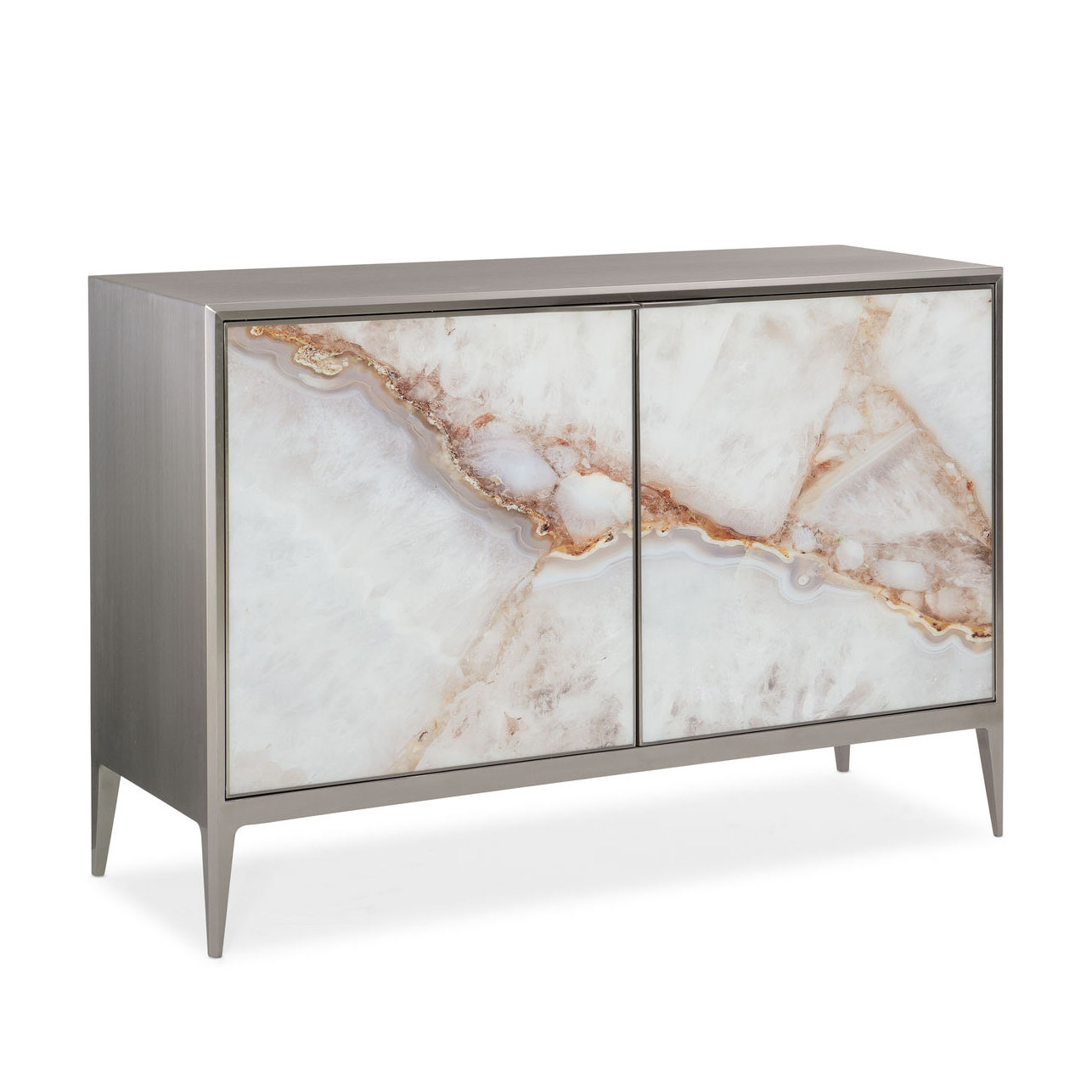 Комод ROCK STEADY спроектированный американским мебельным брендом Caracole – настоящая жемчужина в океане дизайнерских решений. Его облик опирается на красоту совершенно несовершенных форм природного камня. Фасады дверей украшен изысканным агатовым узором. Чистые линии металлической рамы выполненной в элегантном оттенке матового никеля, позволяют наслаждаться красотой уникального рисунка. Узкие конические ножки завершают образ этого уникального предмета обладающего неоспоримой харизмой.