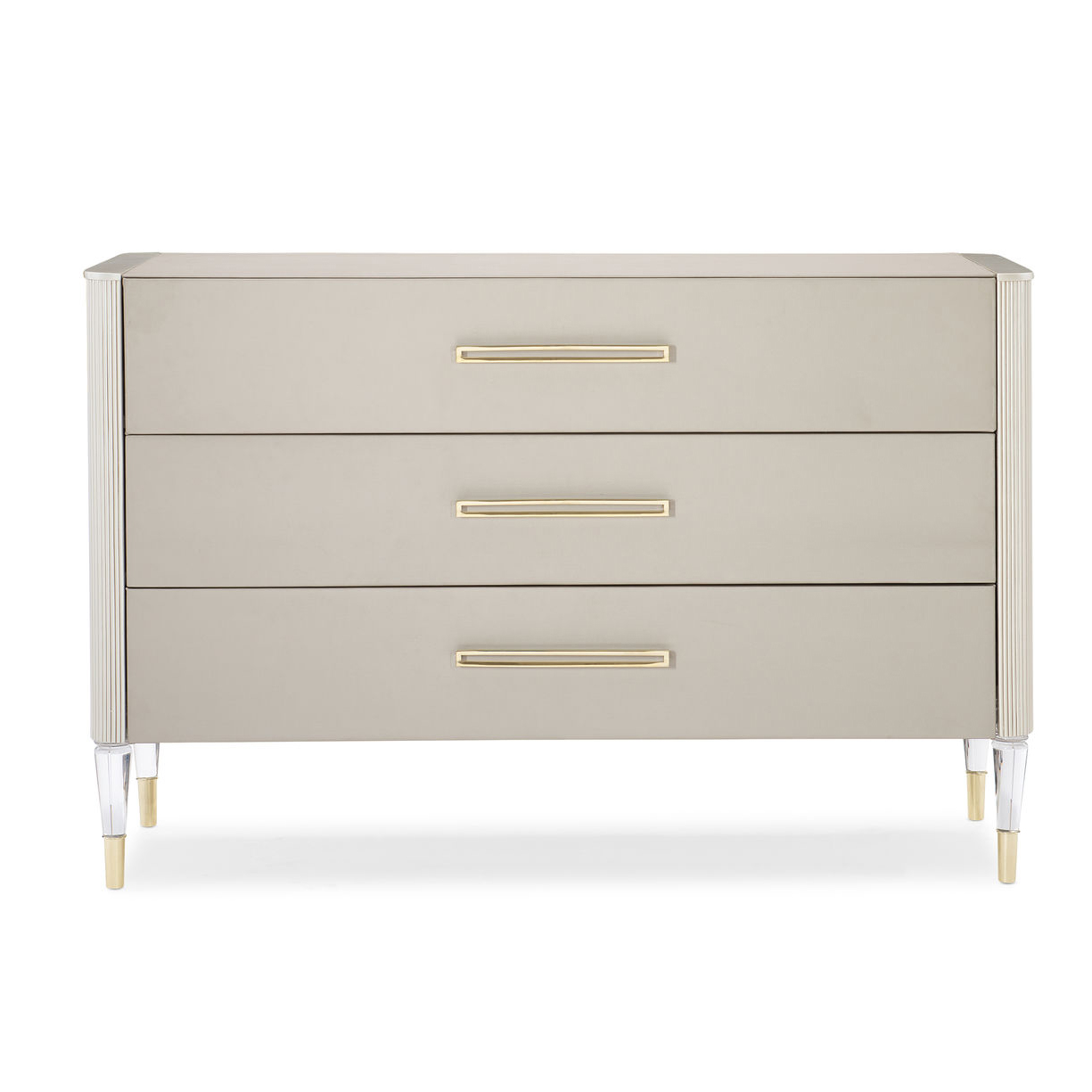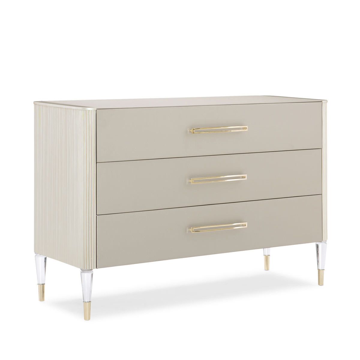 Незабываемый комод I LOVE IT! От американского бренда Caracole отличается вдохновенным сочетанием материалов. Фасады выдвижных ящиков и поверхность комода выполнены в шагреневой коже жемчужного оттенка, а уникальные рифленые боковины оживают в оттенках перламутровой отделки (Matte Pearl). Металлические наконечники конических акриловых ножек и оригинальная фурнитура в золотистом оттенке (Whisper of Gold) завершают образ добавляя в атмосферу немного гламура.