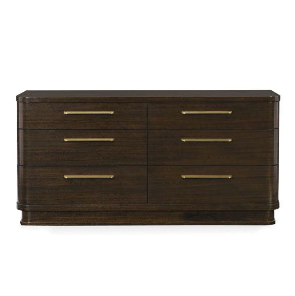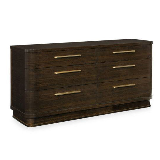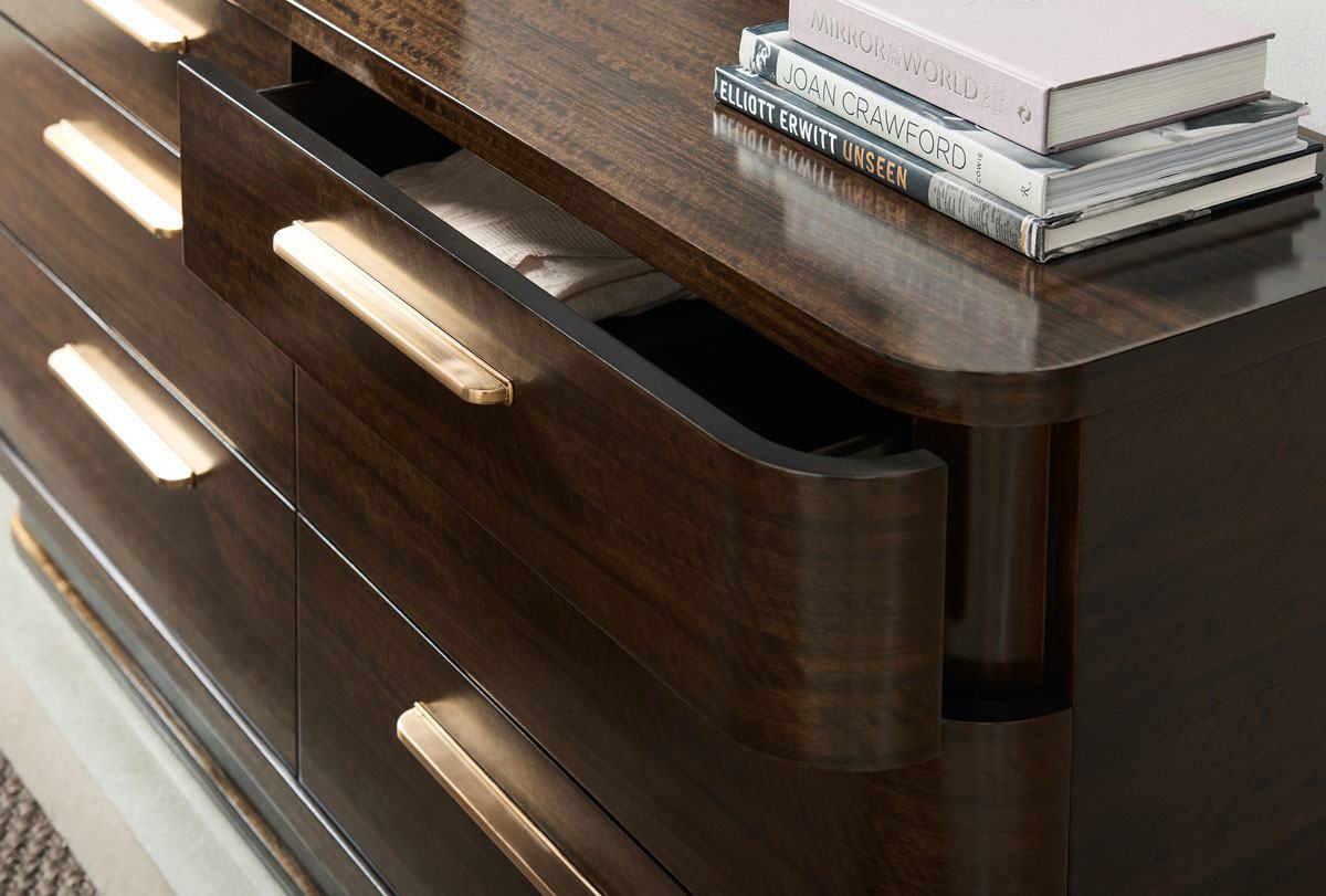 Традиционный комод с классическими элементами эпохи рационализма не теряет своей актуальности. Закругленные углы и низкий плинтус придают уникальный характер корпусу из мореного фигурного эвкалипта цвета бурбона с глянцевой отделкой. Вместительные ящики с доводчиками украшены длинными металлическими ручками с сияющим бронзовым оттенком, а один из них снабжен отделением для украшений.
