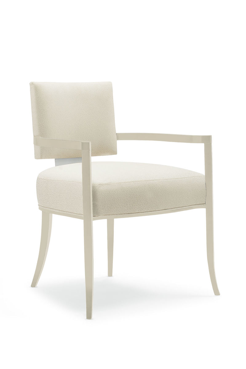Обеденный стул Reserved Seating от американского бренда Caracole — современная интерпретация древнегреческого стула Клисмос с гнутой спинкой и «саблевидными», изогнутыми наружу ножками. Широкая сияющая металлическая панель на задней стороне спинки добавляет нотку гламура образу предмета. Сатиновая ткань нейтрального оттенка с тонким муаровым узором полностью покрывает квадратную спинку и подушку сиденья изделия, которые опираются на открытую деревянную раму и ножки, отделанные кожей. Эта модель покорит вас своей поистине изысканной привлекательностью.