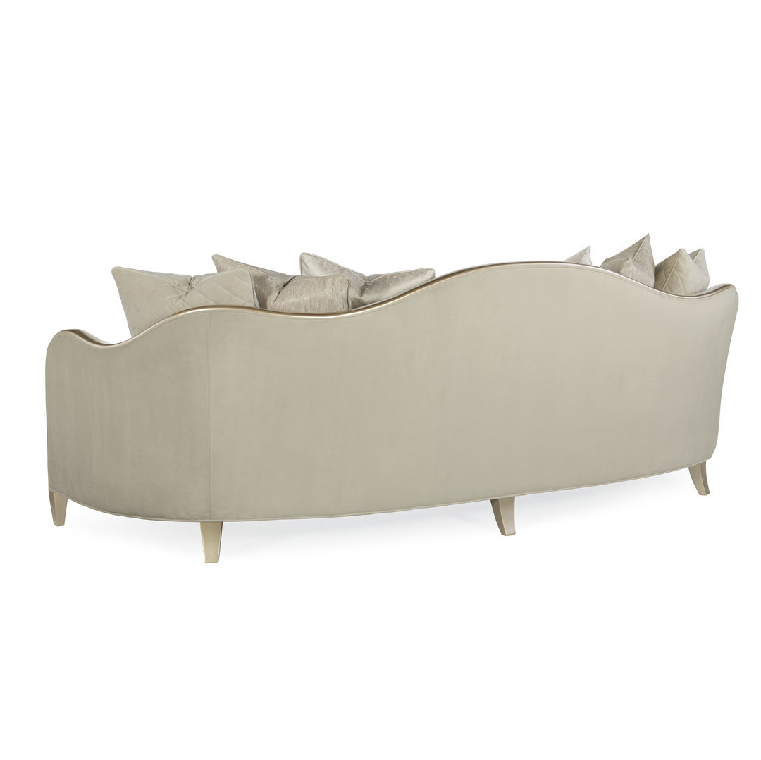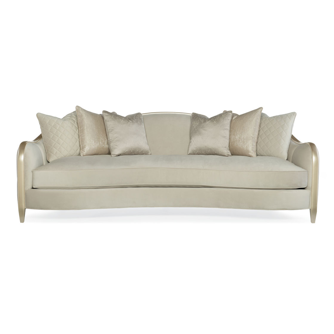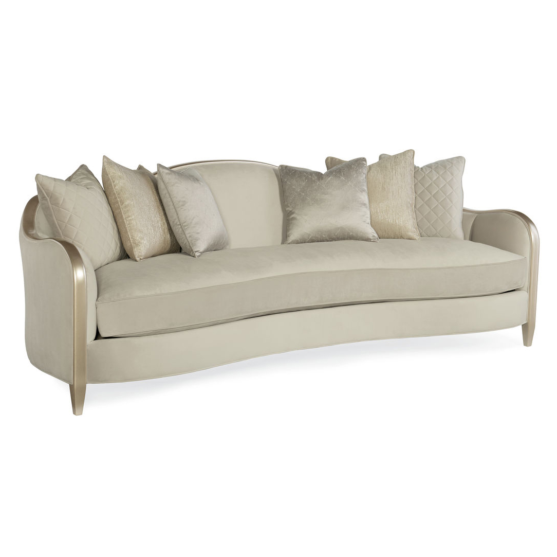 Американский диван Adela от Caracole обладает элегантной формой с изящным закругленным изгибом, создающим сплошную линию от одного подлокотника к другому. Выступающий каркас в виде деревянных крыльев с резным узором жемчужного оттенка на концах подлокотников придает силуэту модели неповторимую оригинальность. На этом сходство со старинным диваном - кабриолетом заканчивается: изделие обито модной тканью букле кремового цвета с эффектом мягкого сияния, а внешняя часть спинки с выразительным вырезом украшена тонкой прошивкой ромбами. Сплошная фигурная подушка сиденья, а также шесть контрастных декоративных подушечек из фактурных тканей разных оттенков (от фиолетового до лавандового) делают этот роскошный диван максимально комфортным.