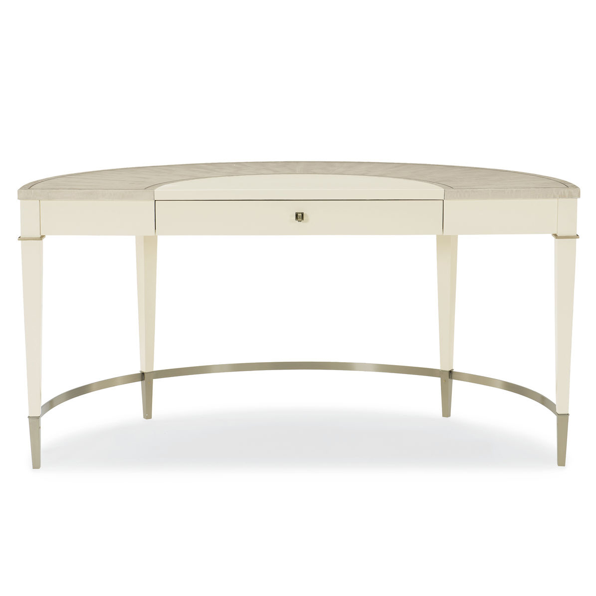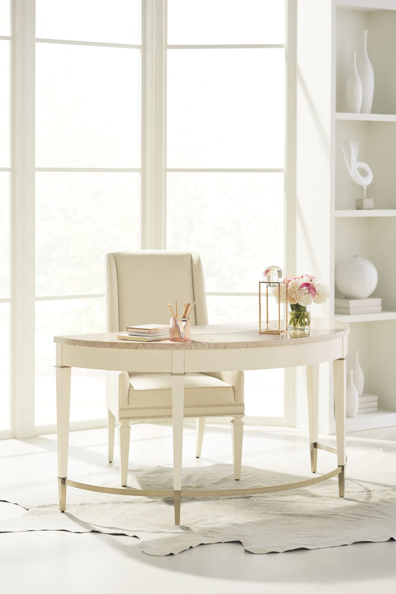 Капелька гламура и нотка элегантности не только не помешают рабочей обстановке, а, наоборот, сделают ее непринужденной и творческой. Это легко подтверждает яркий письменный стол Half The Time! неотразимого дизайна от американского производителя элитной мебели Caracole. Нетипичная полукруглая столешница в форме полумесяца из отделанного под мрамор шпона Анегре с элегантным платиновым покрытием обрамлена капом земляничного дерева, украшенным сияющими деталями. Рабочая поверхность и фасад ящика этого роскошного письменного стола покрыты фактурным винилом цвета слоновой кости, что придает модели и функциональности, и стиля. Прекрасное изделие демонстрирует фартук и сужающиеся ножки с золотыми акцентами, а металлические наконечники и закругленная стяжка, покрытая позолоченной поталью, — секрет неоспоримой элегантности этой модели.