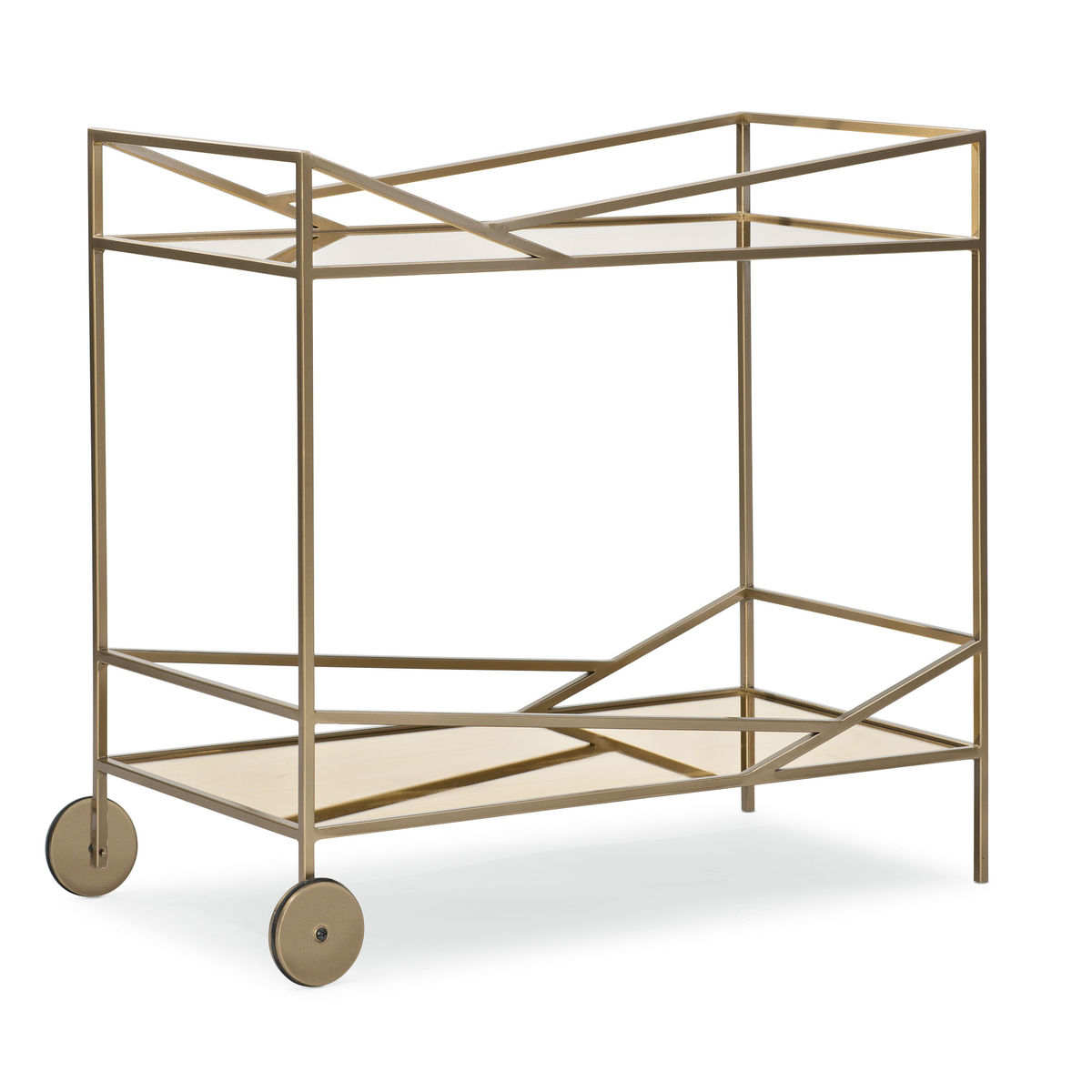 Сервировочный столик Vector - это вечеринка на колесах. Открытый каркас из металлических опор в архитектурном стиле придает этому изделию современный характер, а теплая светящаяся бронзовая отделка гарантирует, что оно идеально впишется в интерьер. Две бронзовые зеркальные полки идеально подходят для хранения и/или демонстрации.