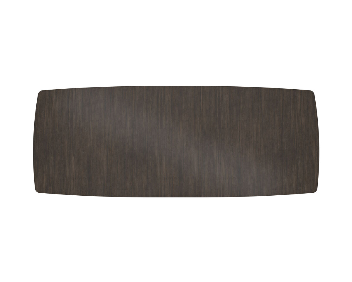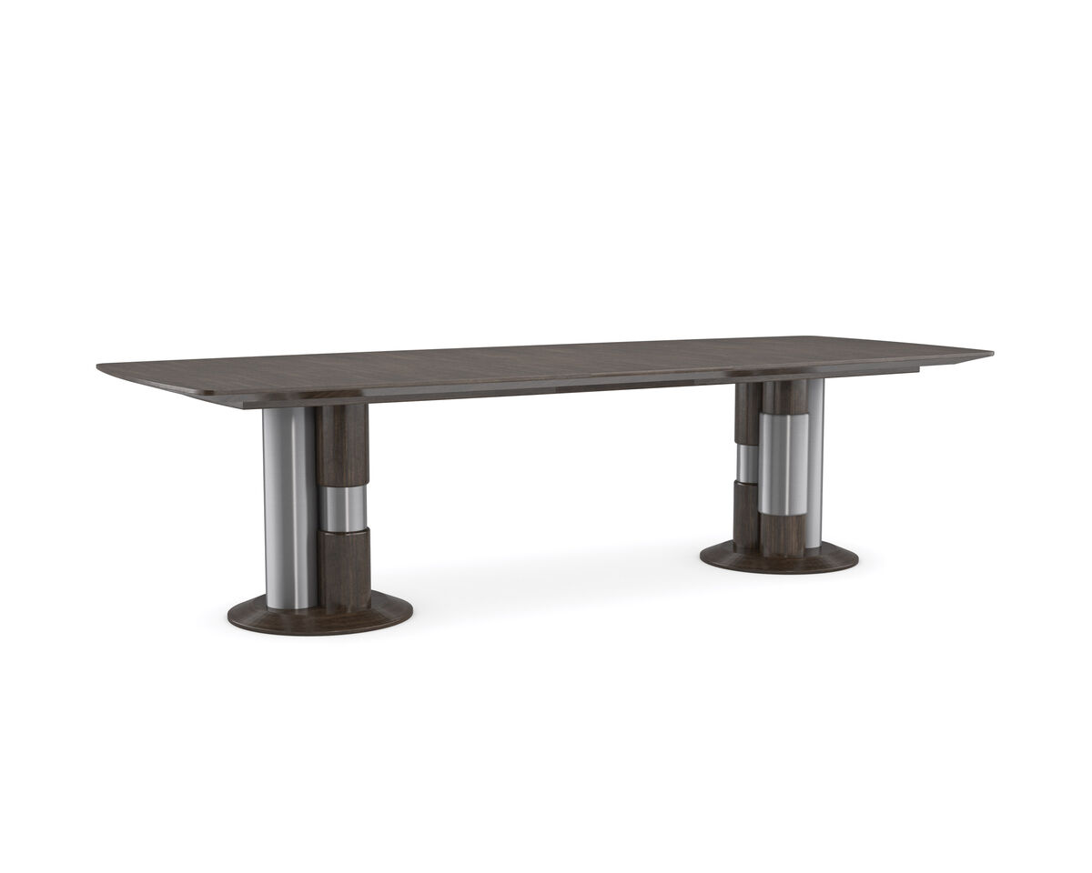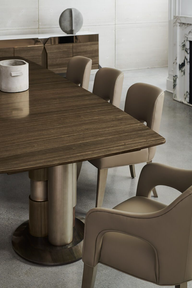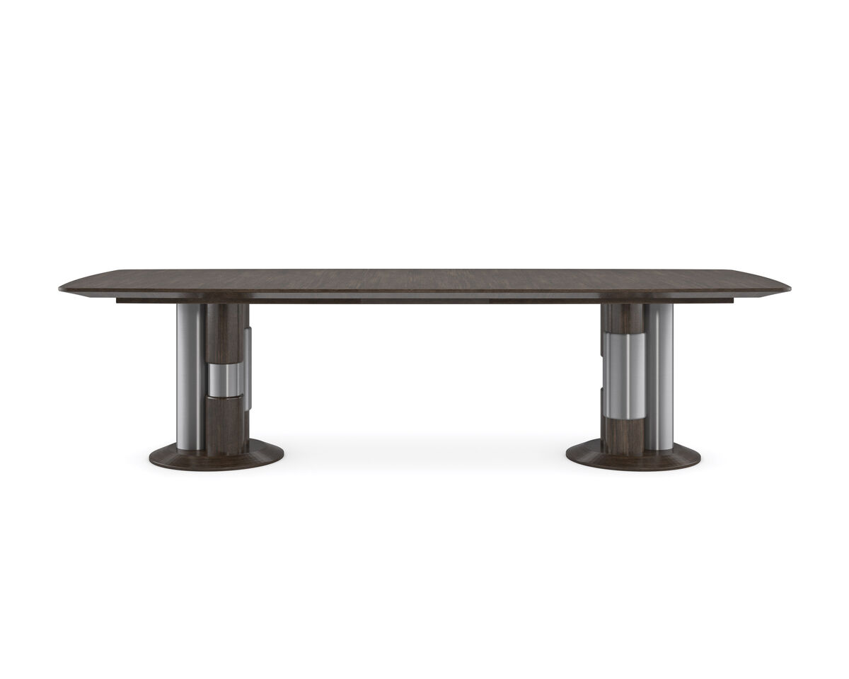 Минималистская столешница крупного размера с четкими линиями и скошенным фартуком придают столу современный шик и элегантность. Ножки пьедестала вдохновлены классическими колоннами и изготовлены из стилизованной сепии и дымчатой нержавеющей стали, придавая обеденному столу утонченный вид.