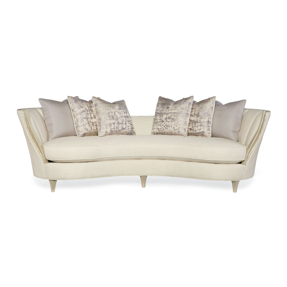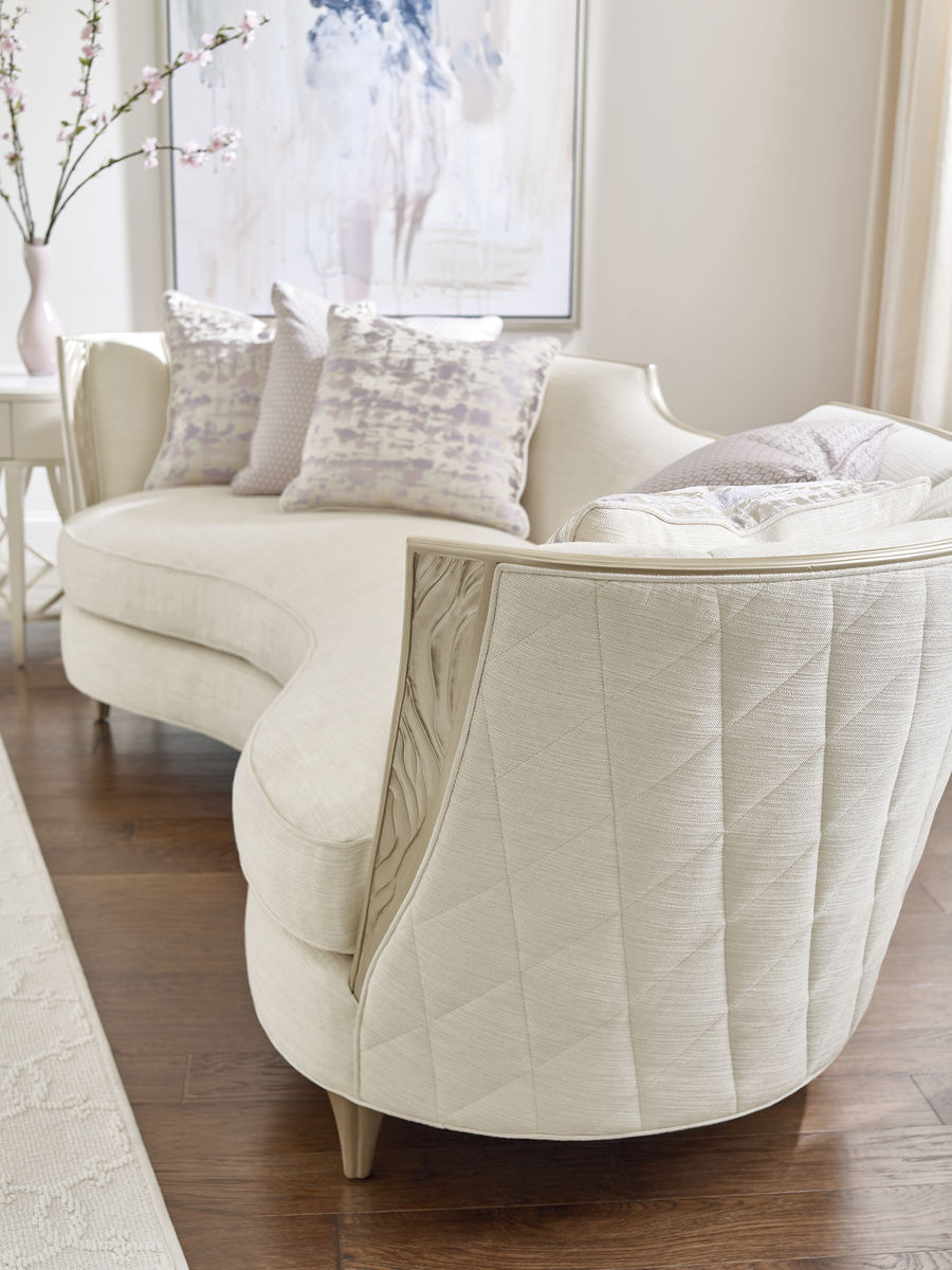 Диван Adela с акцентными резными "крыльями" на каждом подлокотнике создает элегантный профиль с изящным изгибом, который обрамляет протяженную линию от подлокотника к подлокотнику. Дизайн дополняется утонченной открытой оправой, которая выделяется благодаря покрытию в оттенке Blush Taupe. Диван обит креативной тканью в букле кремового оттенка с нежными переливами. Эффектный вырез на спинке добавляет скульптурности изделию, а красивый стеганый узор украшает внешние стороны дивана. Уникальное изогнутое сиденье обеспечивает комфорт и мягкость этому величественному дивану, который дополняется шестью контрастными декоративными подушками в текстурных оттенках, включая фиолетовый и бледно-лиловый.
