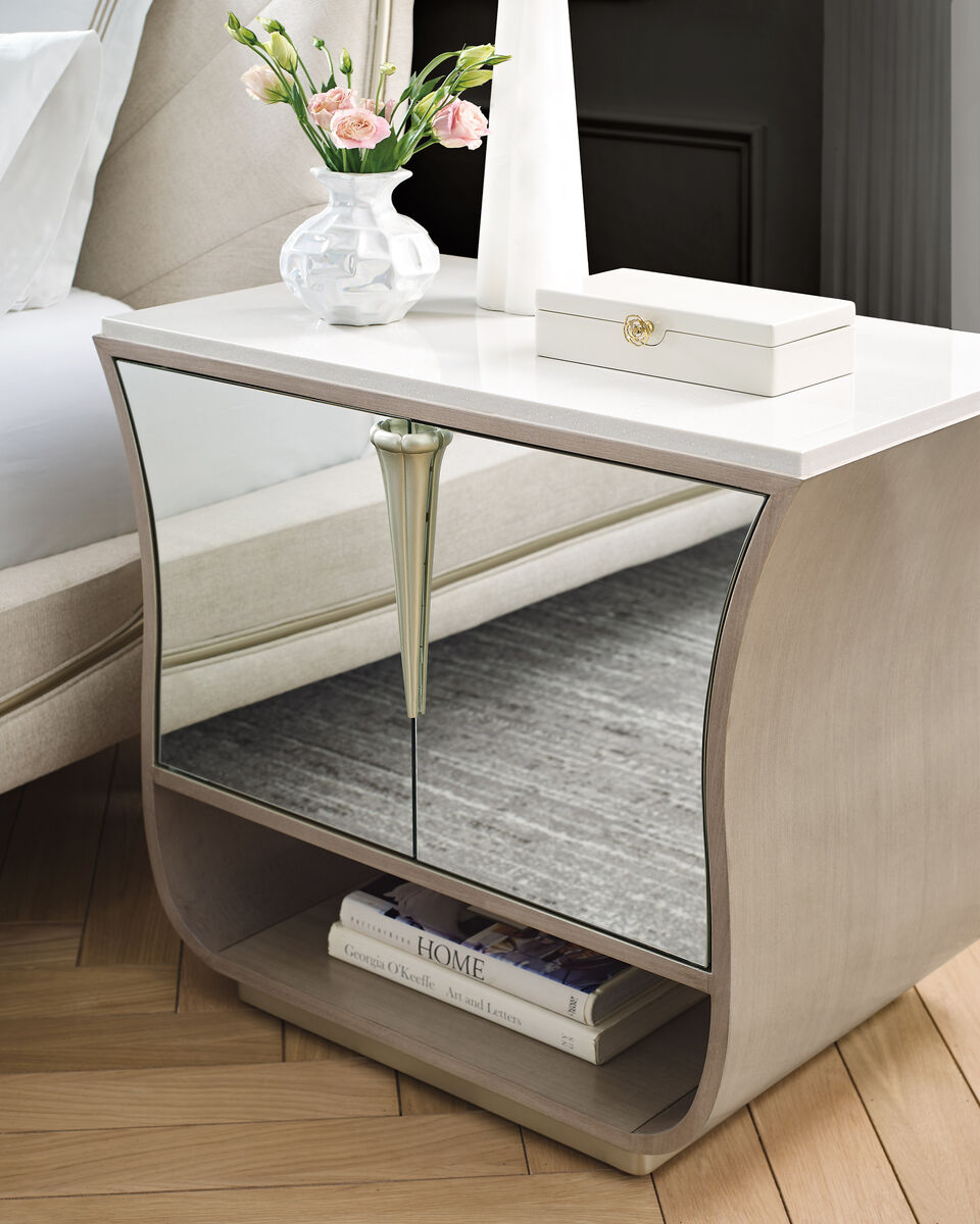 Эта роскошная прикроватная тумбочка Lillian объединяет дерево и камень, придавая классический характер этому изысканному дизайну. Зеркальные дверцы добавляют шарма, напоминая форму тюльпана, которая изящно сбалансирована на простом цоколе в нежном оттенке Soft Radiance.