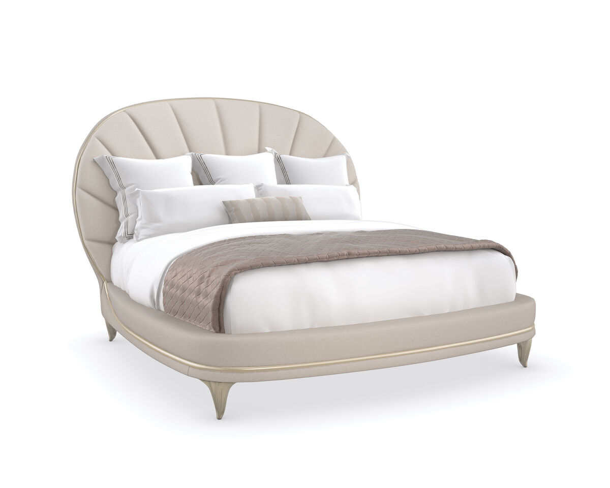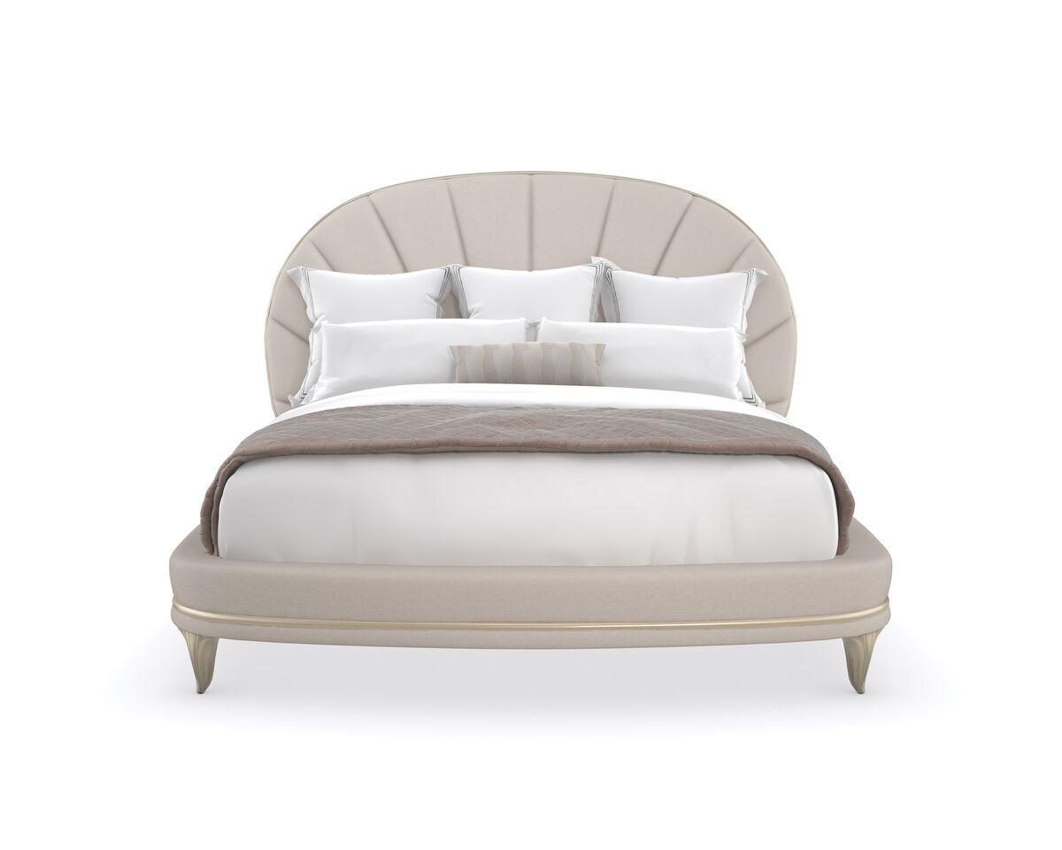 Изножье кровати имеет форму полумесяца, что позволяет использовать его для удобного сидения в конце кровати. Этот элемент добавляет функциональность и удобство, создавая уютное место для отдыха и обувания.