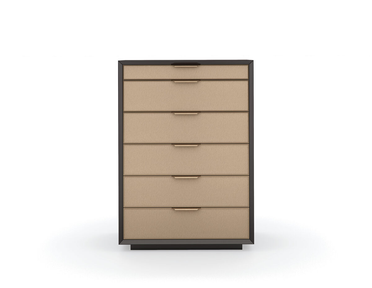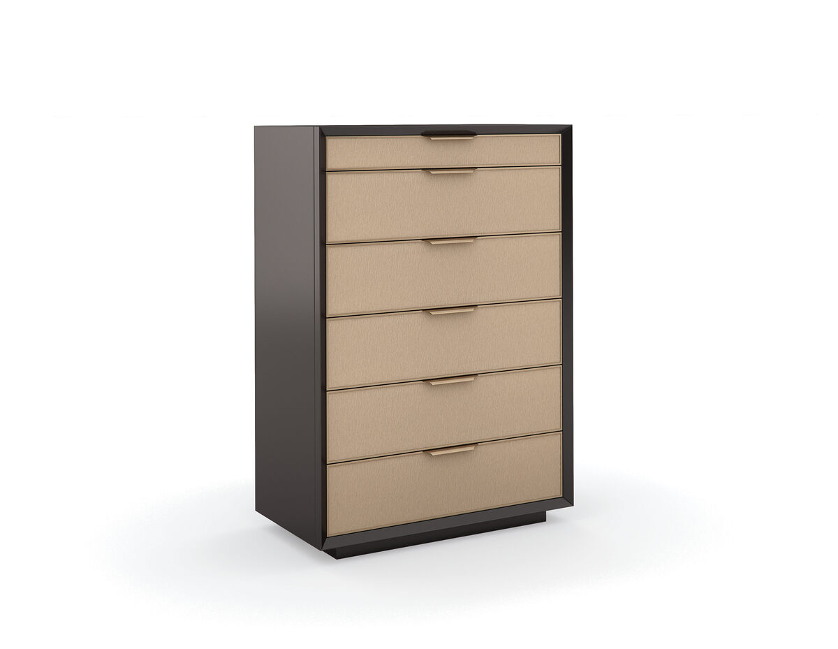 Комод Wrap It Up от Caracole приносит в интерьер спальни изысканный стиль, вдохновленный архитектурой, где минимализм сочетается с элементами модерна. Фронтальная часть каждого ящика обернута красиво текстурированным винилом с изысканным тиснением, напоминающим ручейки дождя, мягко стекающие по оконному стеклу.