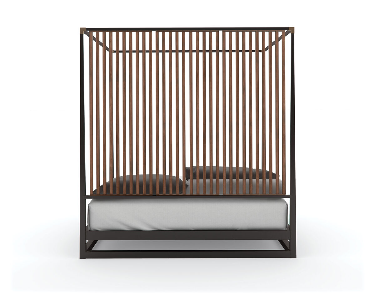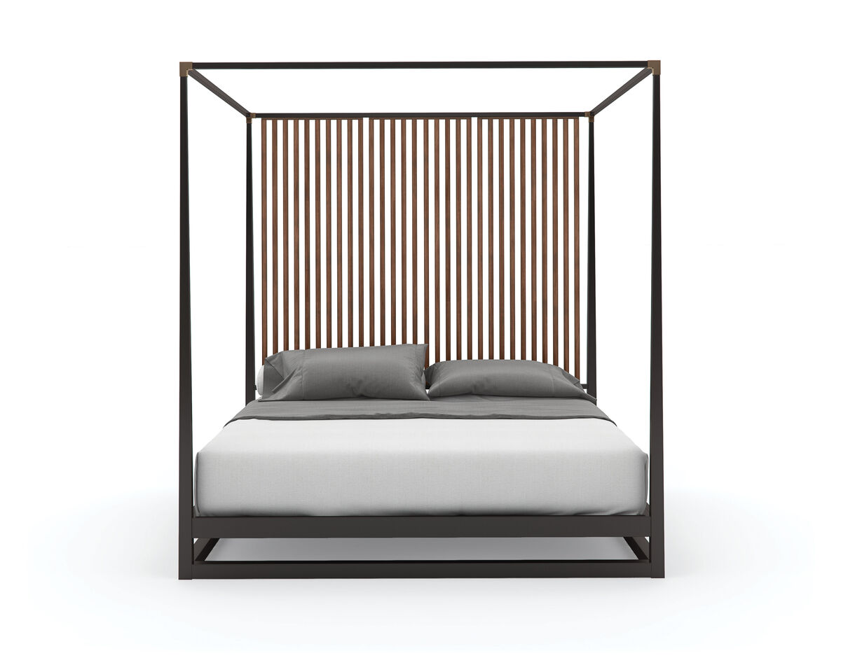 Каскадные линии этой обновленной версии классической кровати с балдахином создают смелый фон, впечатляющий своей элегантностью. Ее дизайн, вдохновленный архитектурой, включает в себя вертикальные планки из прочного орехового дерева Rich Walnut, которые прекрасно контрастируют с навесом цвета Dark Chocolate и стойками, украшенными изысканными кронштейнами цвета Champagne Gold.