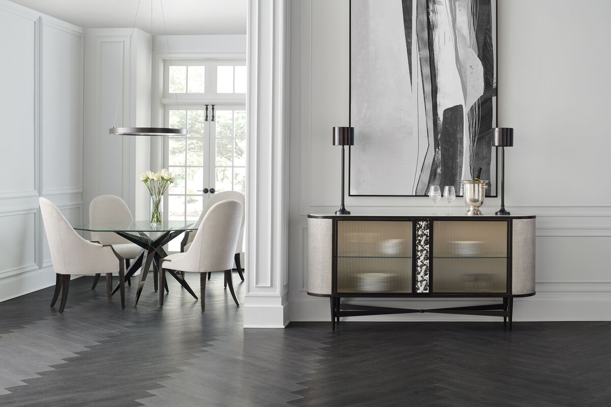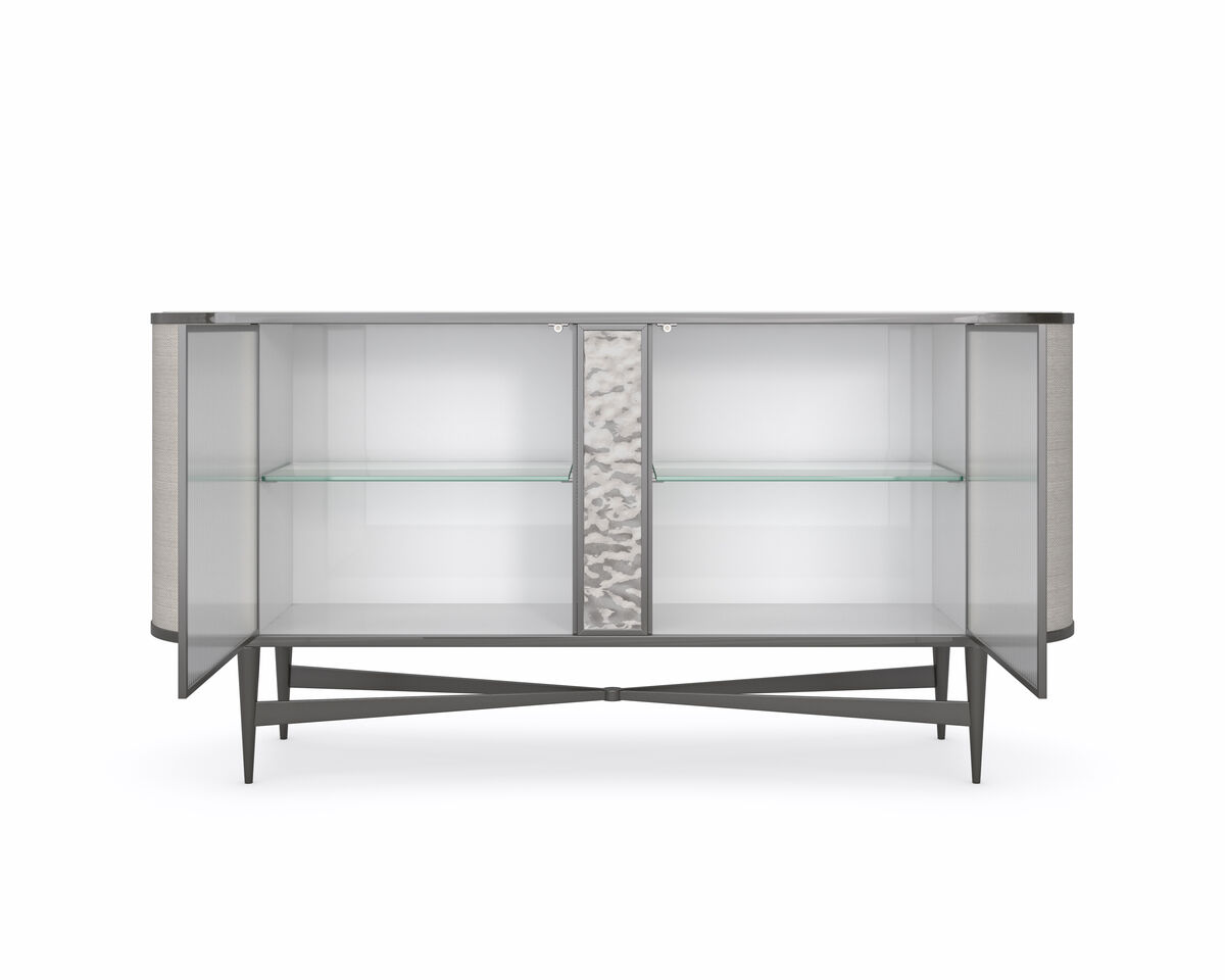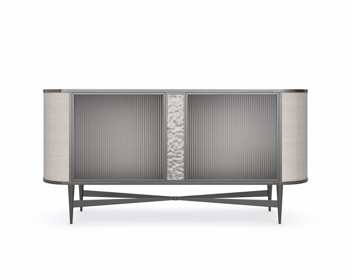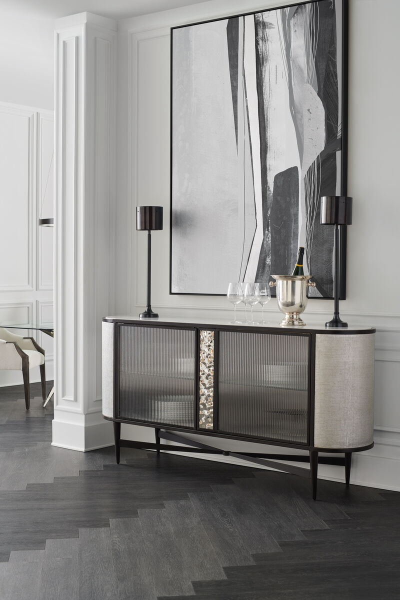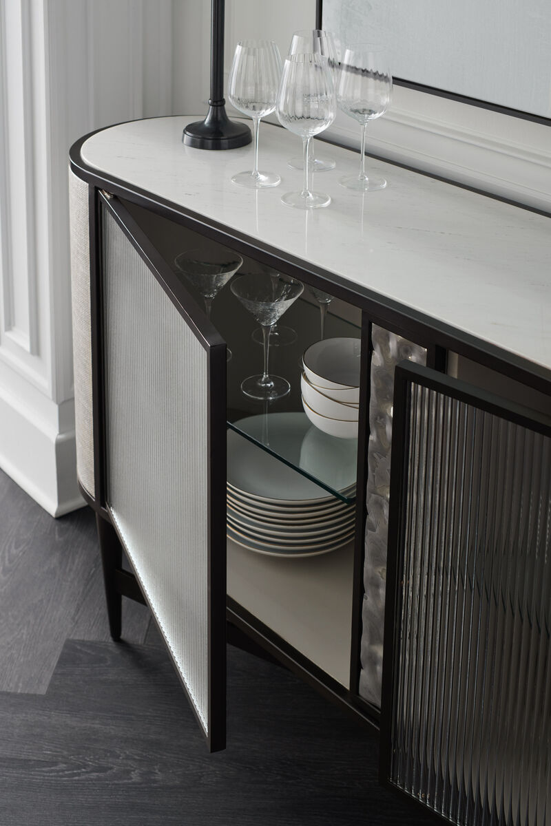 Этот овальный буфет Has It All воплощает в себе красоту, функциональность и тактильные качества, сочетая серебряную рафию Sun-kissed, литое тростниковое стекло, металл с текстурой ямочек и столешницу из белого мрамора. Он предлагает обилие места для хранения с полками из закаленного стекла и внутренней светодиодной подсветкой, управляемой сенсорным диммером, создавая дополнительное мерцание. Этот буфет красиво дополняет интерьеры столовых, гостиных, холлов и прихожих.