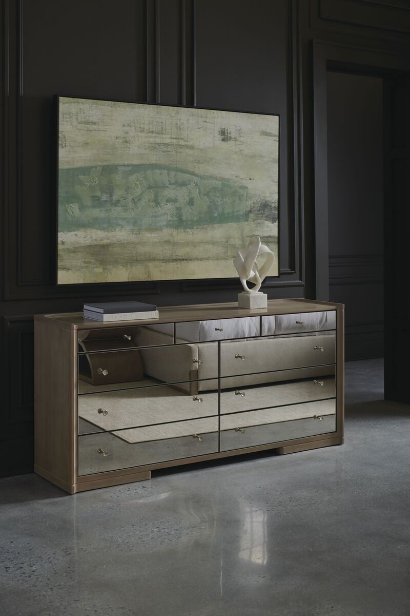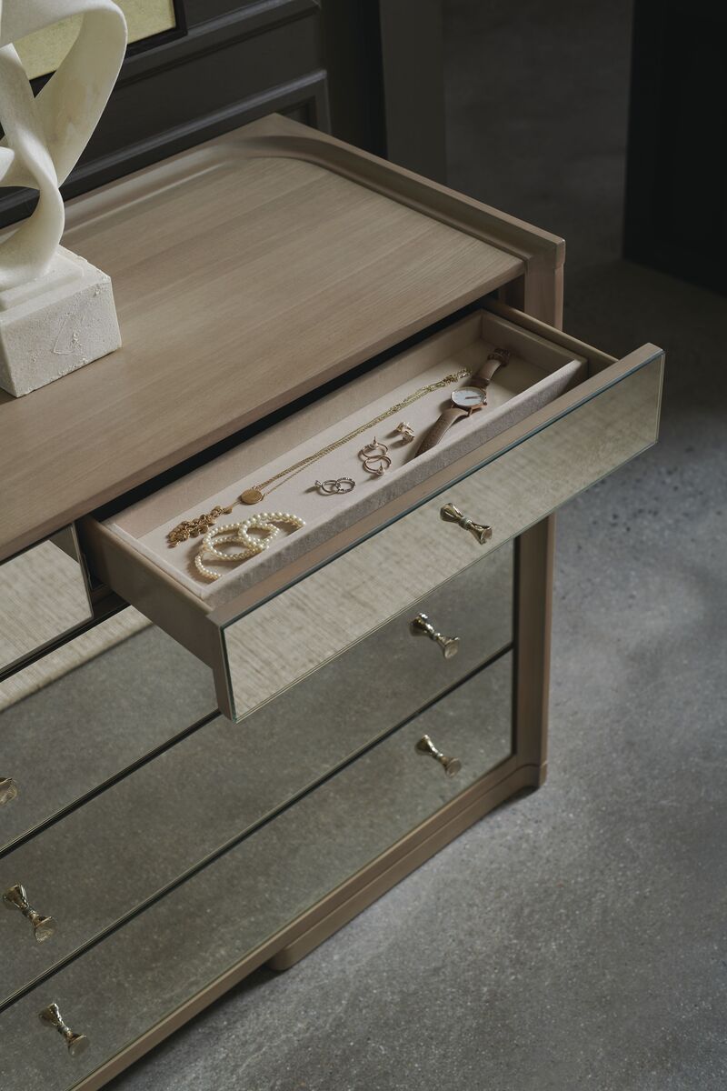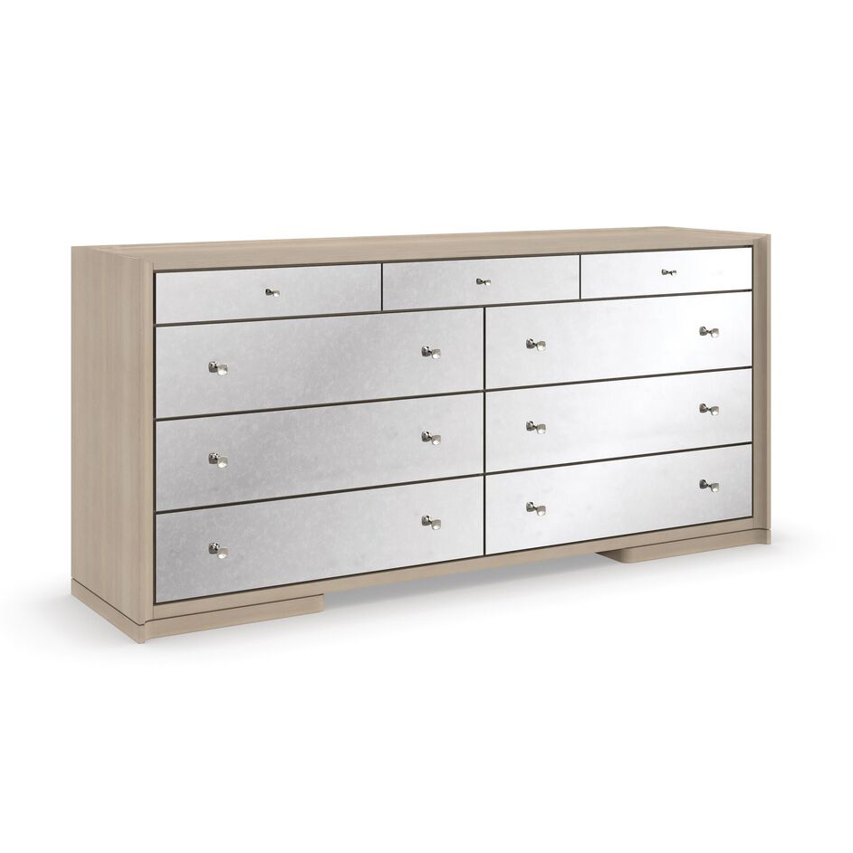 Комод Living The Dream от Caracole – это изысканный представитель уюта и роскоши в вашей спальне. С девятью ящиками, облицованными шпоном японского дерева с теплой отделкой цвета тауп, он приносит в пространство естественность и непринужденную роскошь.