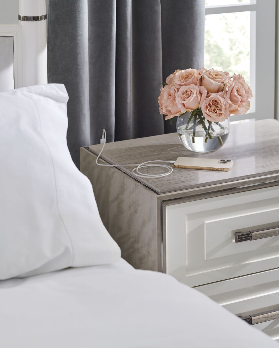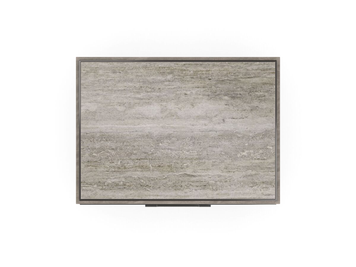 Для добавления нотки роскоши, на тумбочке установлена столешница из травертина, дополненная узорчатой текстурой древесины в шпоне Silver Curupixa с земляной отделкой Mountain Smoke. Эта комбинация материалов придает тумбочке утонченный и изысканный вид.