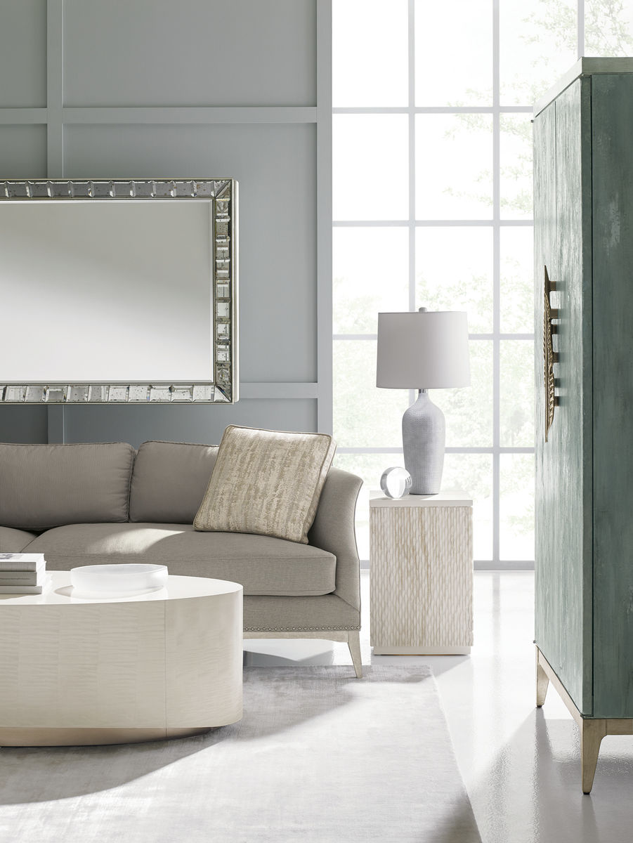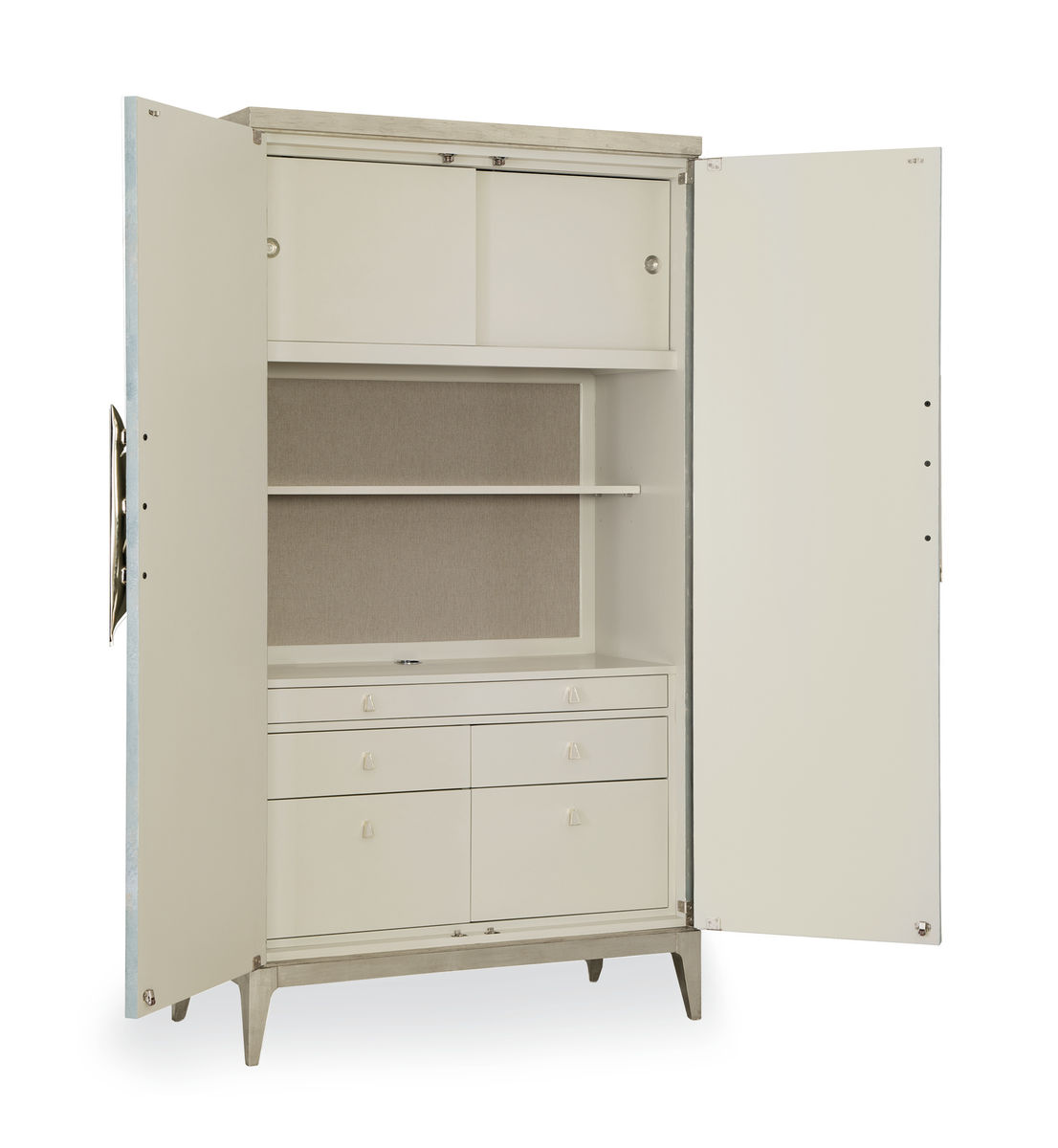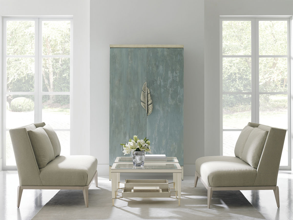 Watercolors представляет собой произведение искусства в стиле Caracole, дополненное уникальными асимметричными дверными ручками с металлическими пальмовыми ветвями. Внутри шкафа есть место для размещения телевизора размером до 107 см, выдвижная поверхность для письма с удобным доступом для шнура, две регулируемые полки за раздвижными дверцами, а также два выдвижных ящика и два ящика для папок.