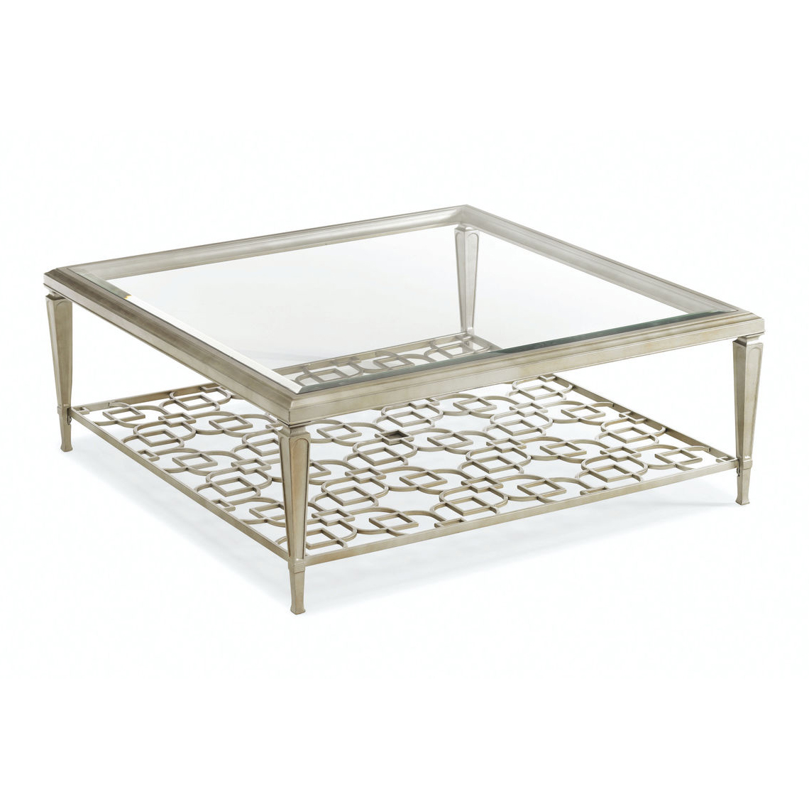 Коктейльный стол Sociables от Caracole, один из самых крупных и эффектных в коллекции, идеально подходит для современных и традиционных интерьеров. Легкий и воздушный дизайн включает металлическую конструкцию и стеклянную столешницу, которые не перегружают пространство. Металл с отделкой Taupe Silver Leaf добавляет элегантности, а под стеклянной столешницей размещен крупный стилизованный узор в виде решетки, привлекающий внимание. Открытая полка может использоваться для размещения книг или оставаться пустой, подчеркивая детали конструкции.