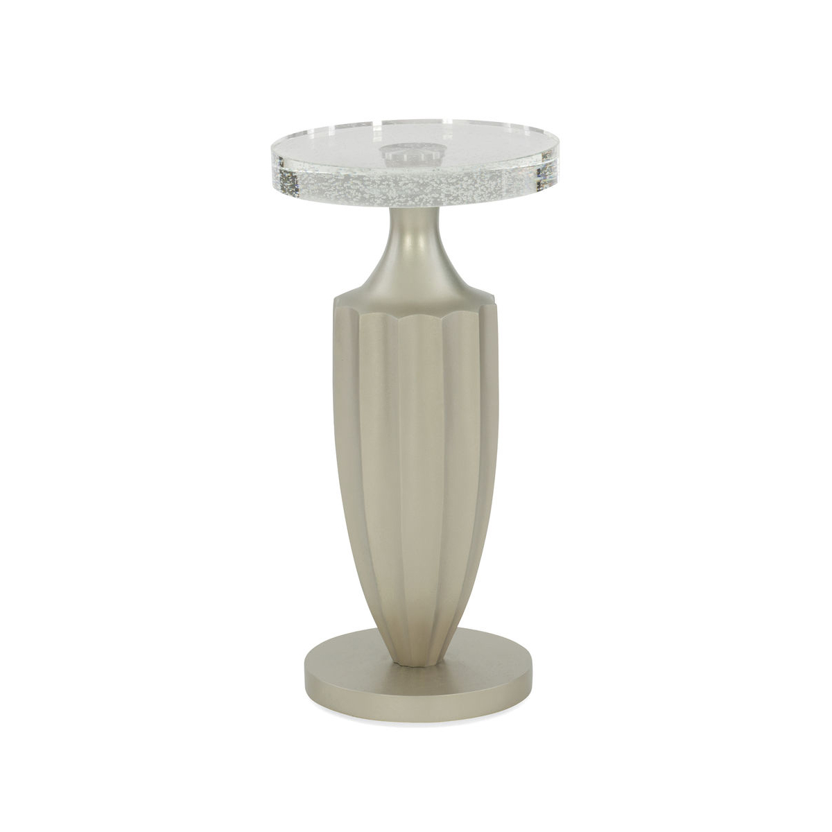 Элегантный рифленый деревянный боковой столик Just A Little Jaz обретает джазовый ритм благодаря столешнице из пузырчатого стекла. Этот искрящийся столик дополнен отделкой Jazzy Taupe, которая закручивается вокруг его миниатюрной формы. Идеально подходит для бокала вина или букета разноцветных тюльпанов. Каждый кусок литого пузырчатого стекла уникален, с пузырьками разного размера и формы.