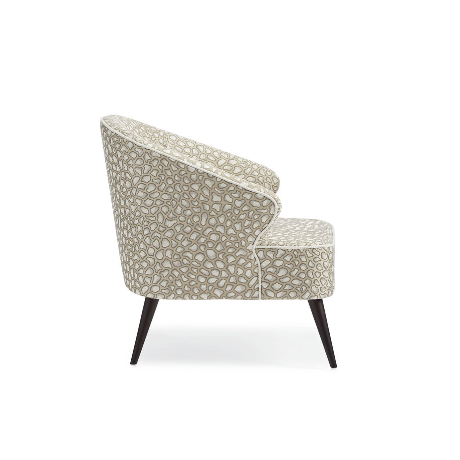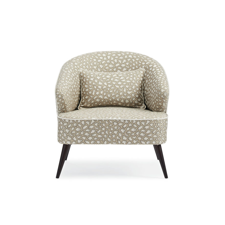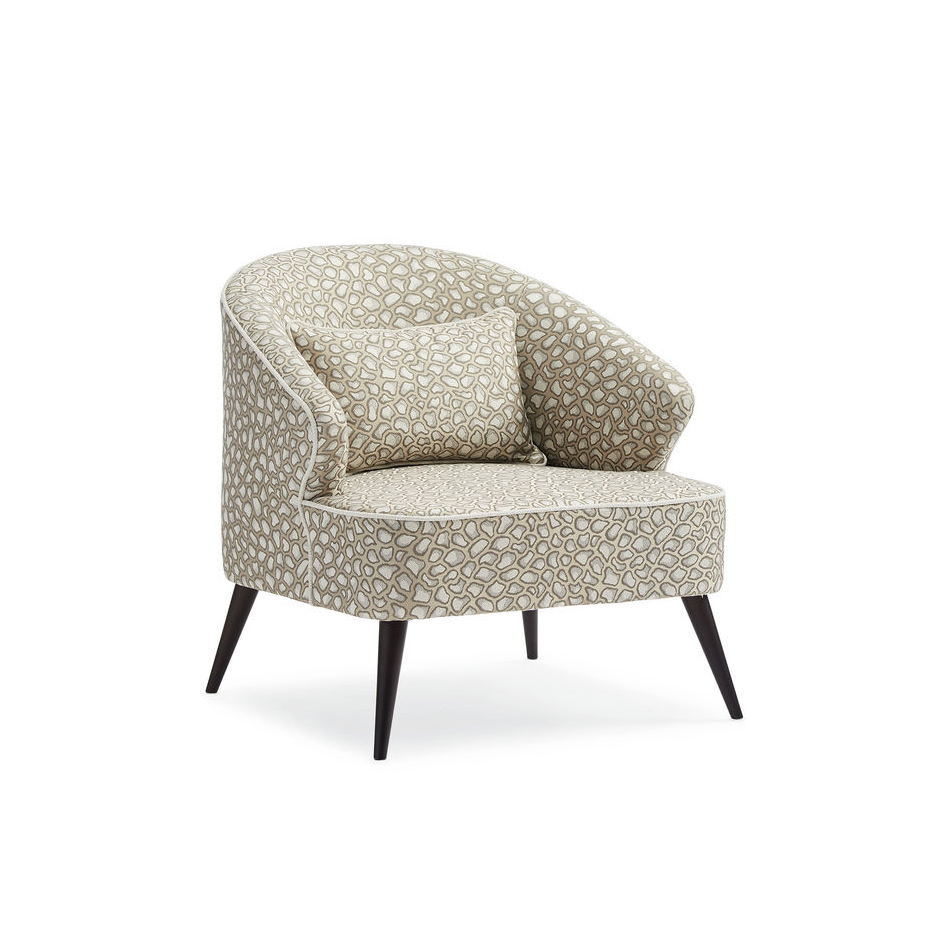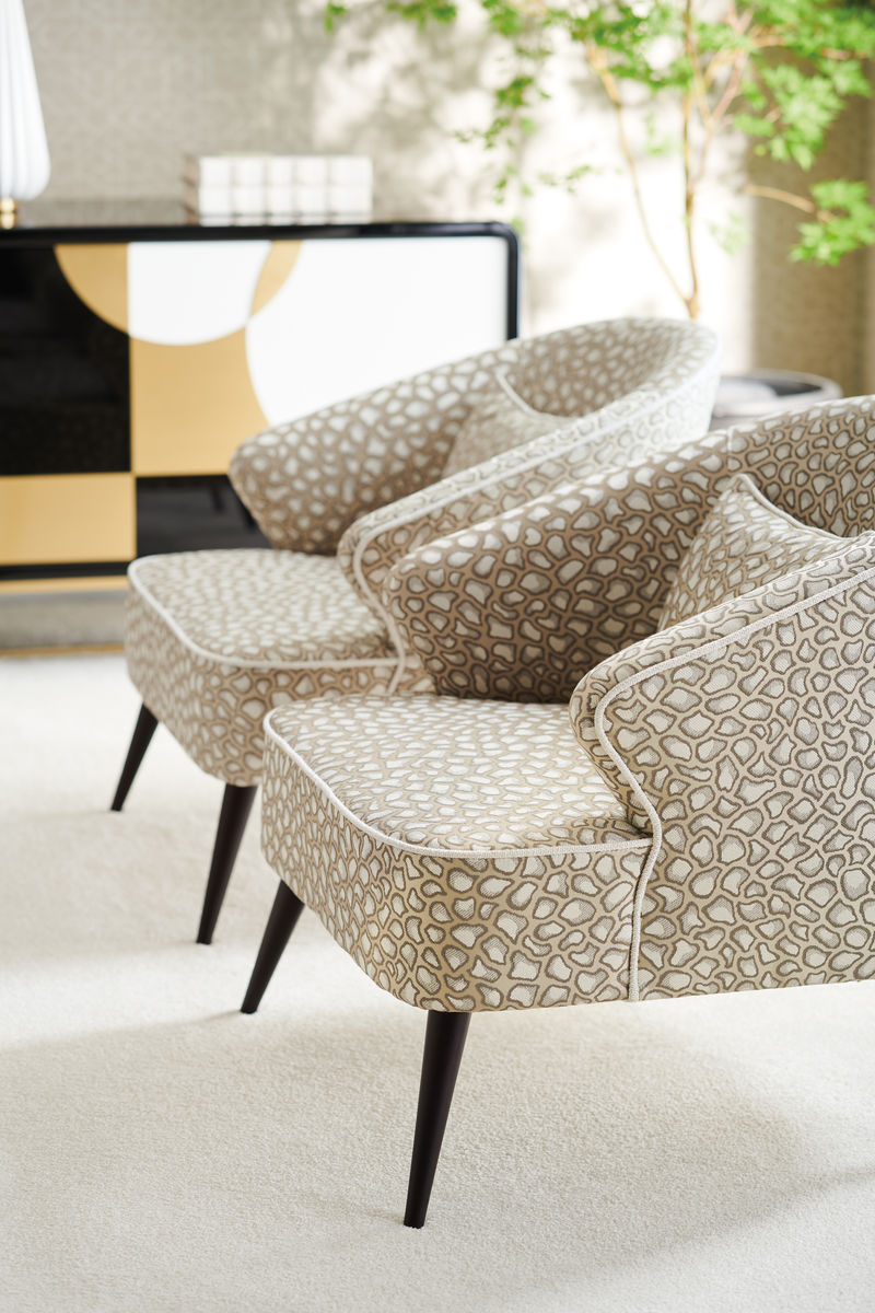 Кресло обито нейтральной тканью с анималистической вышивкой, выполненной в мерцающем золотисто-сером оттенке, что добавляет ему изысканности и шарма. Оно стоит на угловатых деревянных ножках в стиле модерн середины века, создавая гармоничное сочетание с общим дизайном. Кокетливый силуэт кресла еще больше подчеркивается белоснежной льняной тесьмой, которая подчеркивает его изгибы и добавляет дополнительный акцент к его элегантности.