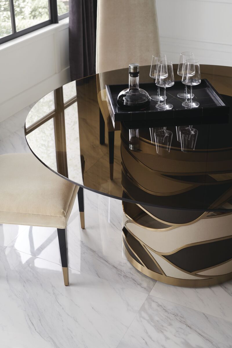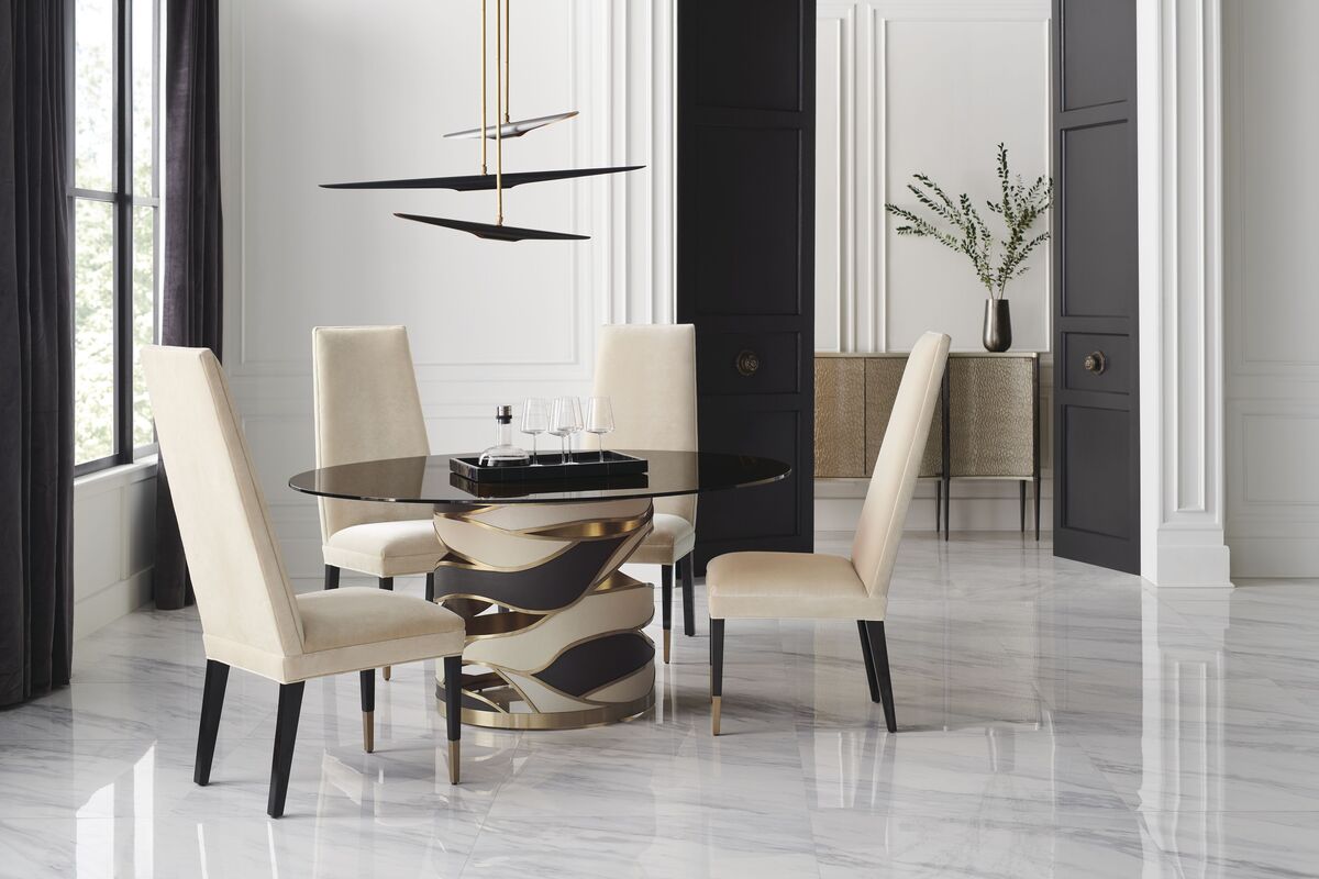 Металлические наконечники с матовым золотым покрытием и лакированные ножки с контрастной отделкой в цвете шоколадного трюфеля придают этой модели классический дизайн с космополитическим шармом. Этот стул не только функционален, но и вдохновляет на создание уютной и роскошной обеденной атмосферы, становясь яркой деталью вашего интерьера.