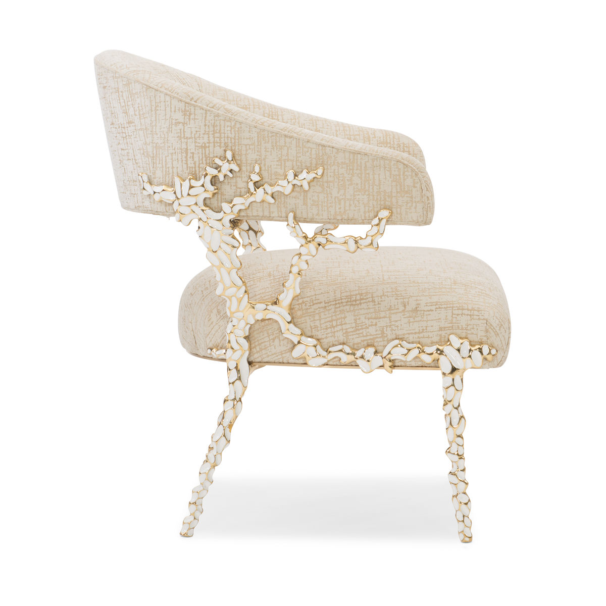 Изготовленное из цельной латуни, кресло имеет прекрасную золотистую отделку, дополненную белой эмалью. Его форма напоминает ветви или кораллы, стремящиеся к свету, создавая впечатление движения и энергии. Это уникальное сочетание материалов и формы делает кресло Glimmer of Hope визуально захватывающим и эстетически привлекательным.