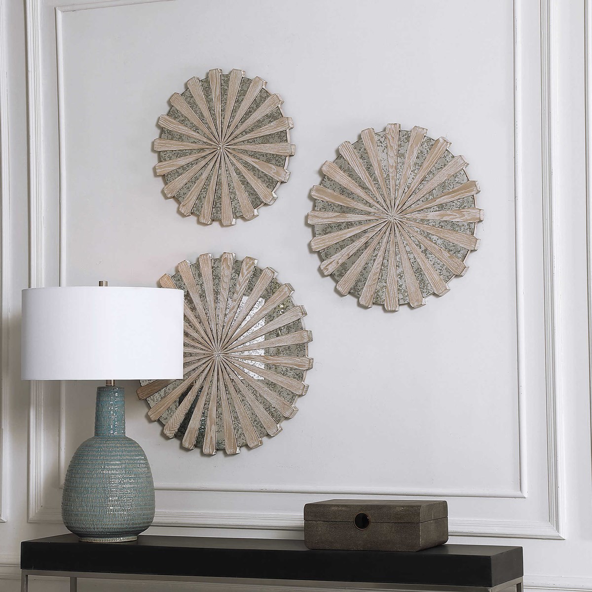 Главным элементом набора являются антикварные зеркальные круглые вставки. Они создают эффектное отражение света и привносят игру света и тени в пространство. Каждое зеркало отражает свою уникальную историю, добавляя неповторимый шарм и характер к декору.