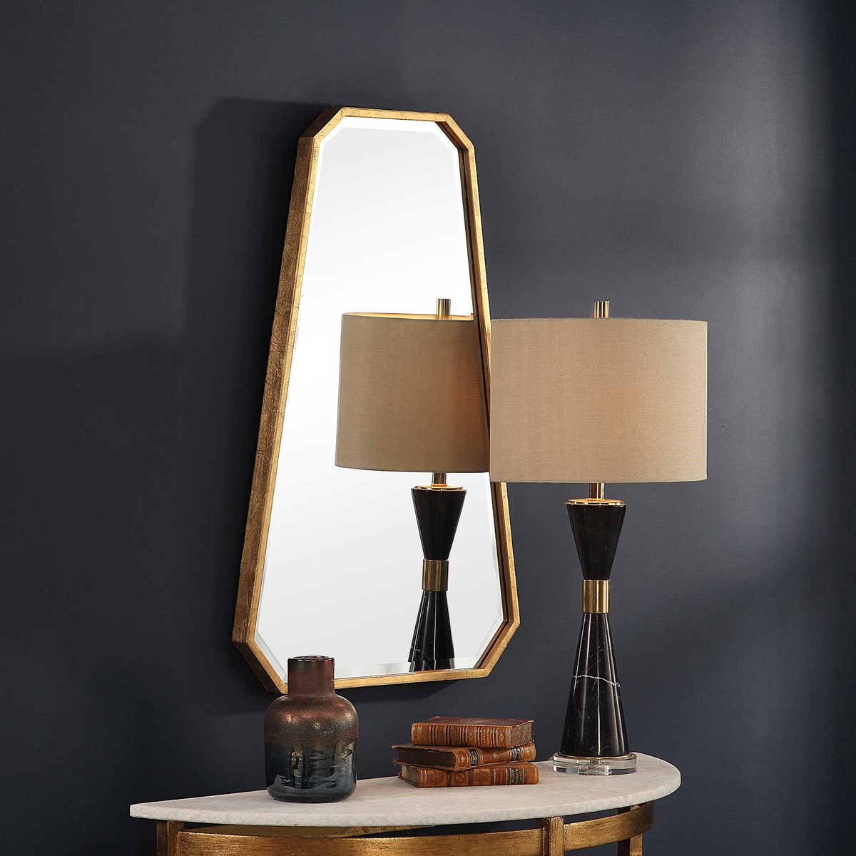 Зеркало Ottone от американского бренда Uttermost представляет собой современное восьмиугольное произведение дизайна с четкими краями и изысканной металлической отделкой из сусального золота. Его геометрический дизайн придает интерьеру современный вид и структуру, а легкая аппликация дополняет общее впечатление.
