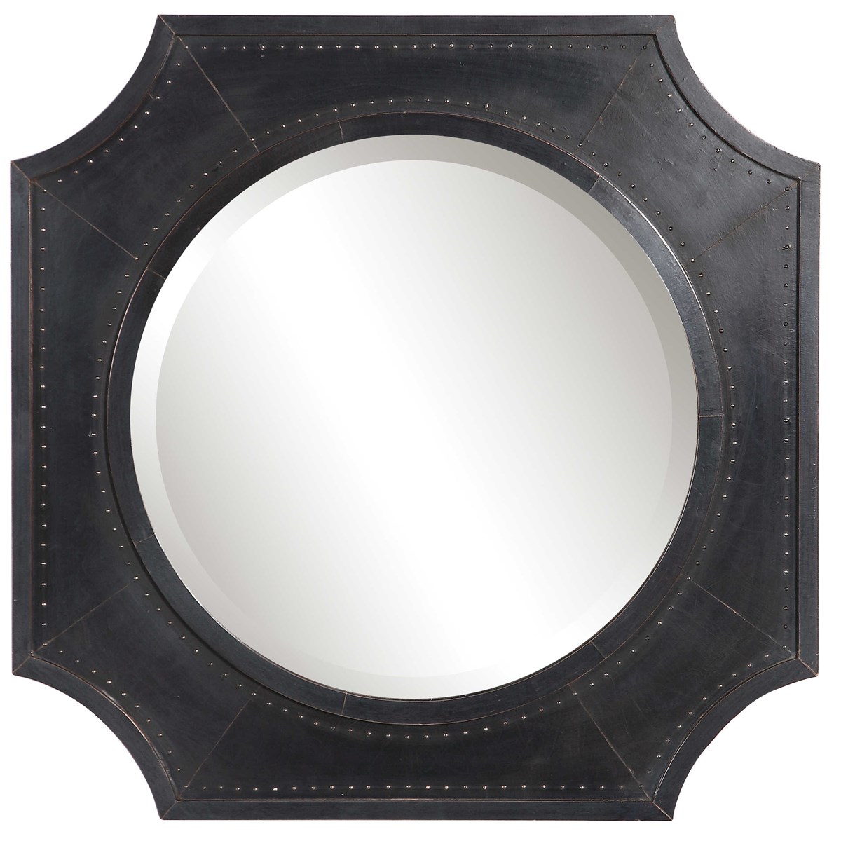 Зеркало выполнено в деревенском стиле и отделано облицовкой из темной меди с декоративными акцентами в виде гвоздей. Эти элементы добавляют зеркалу уникальности и придают ему особый характер.