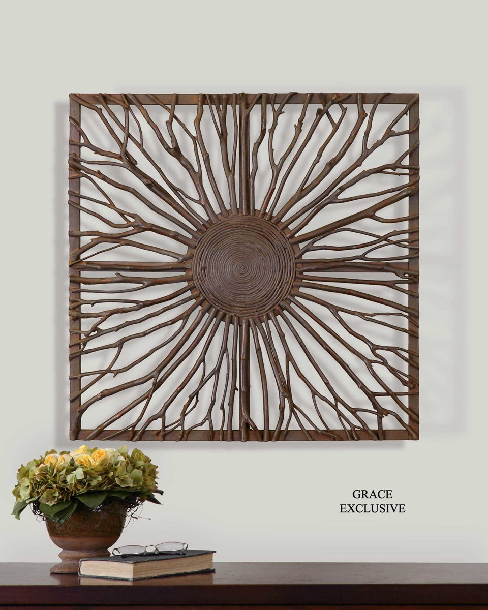Каждая ветвь декоративно обработана и полирована, чтобы выделить ее естественную текстуру и уникальные формы. Светло-серые акценты, дополнительно вплетенные в деревянную раму, придают композиции изящность и гармонию.